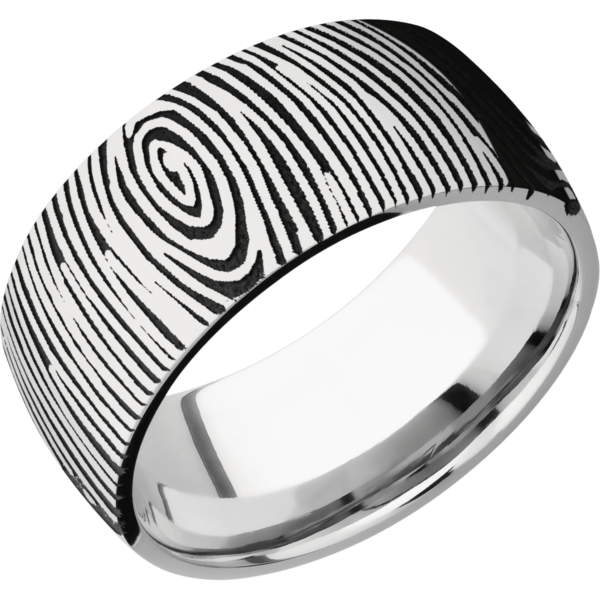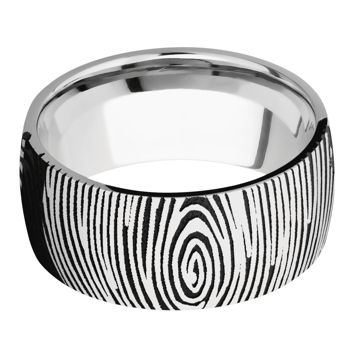 10 mm wide/Domed/10K White Gold band with a laser carved Your Finger Print 2 pattern.