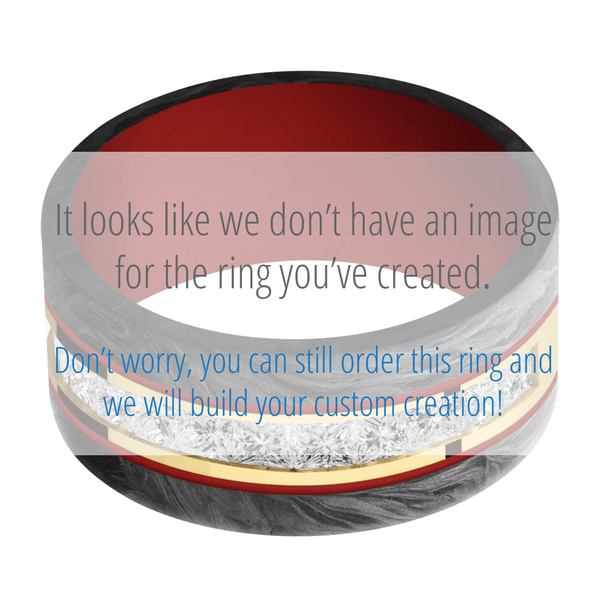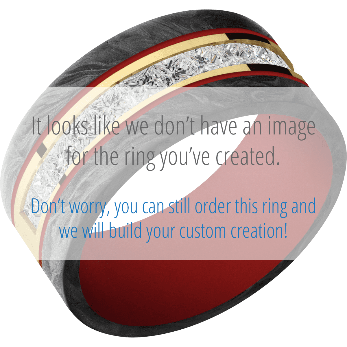 10 mm wide/Flat/10K Yellow Gold band with a Half Eternity arrangement of .06 carat Princess Lab Grown Diamond stones in a Channel setting and featuring two 3 mm Double Off Center Edge inlays of Forged Carbon Fiber also featuring a USMC Red sleeve