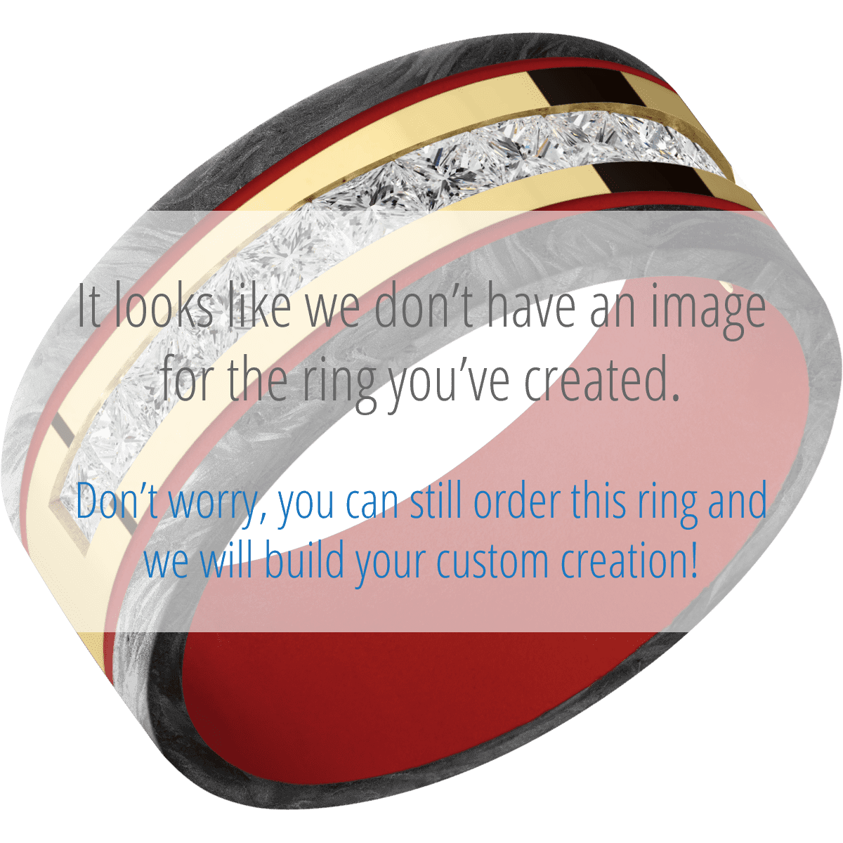 9 mm wide/Flat/10K Yellow Gold band with a Half Eternity arrangement of .06 carat Princess Lab Grown Diamond (ST) stones in a Channel setting and featuring two 2 mm Double Off Center Edge inlays of Forged Carbon Fiber also featuring a USMC Red sleeve