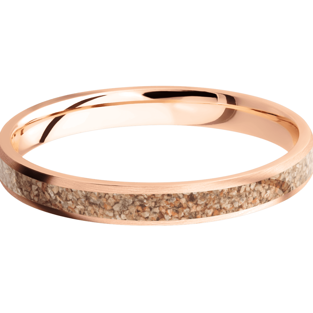 3 mm wide/Domed/14K Rose Gold band with one 2 mm Centered inlay of Dinosaur Bone Tan.