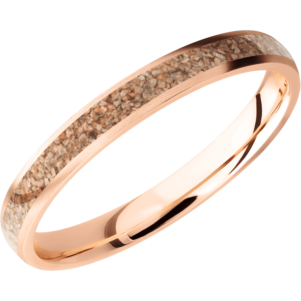 3 mm wide/Domed/14K Rose Gold band with one 2 mm Centered inlay of Dinosaur Bone Tan.