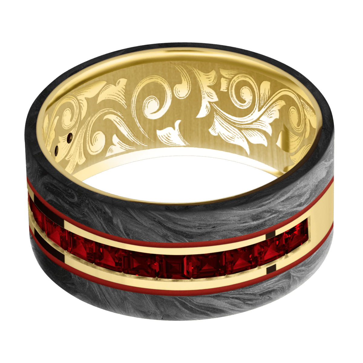 10 mm wide/Flat/14K Yellow Gold band with two 3 mm Double Off Center Edge inlays of Forged Carbon Fiber and featuring a Half Eternity arrangement of .03 carat Princess Dark Ruby stones in a Channel setting