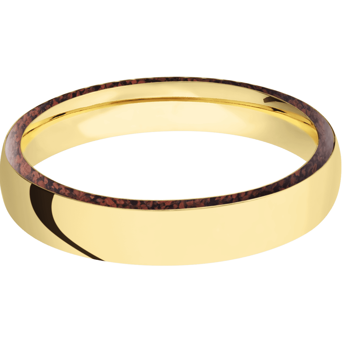 4 mm wide/Domed/14K Yellow Gold band with two 1 mm Side inlays of Dinosaur Bone Red.