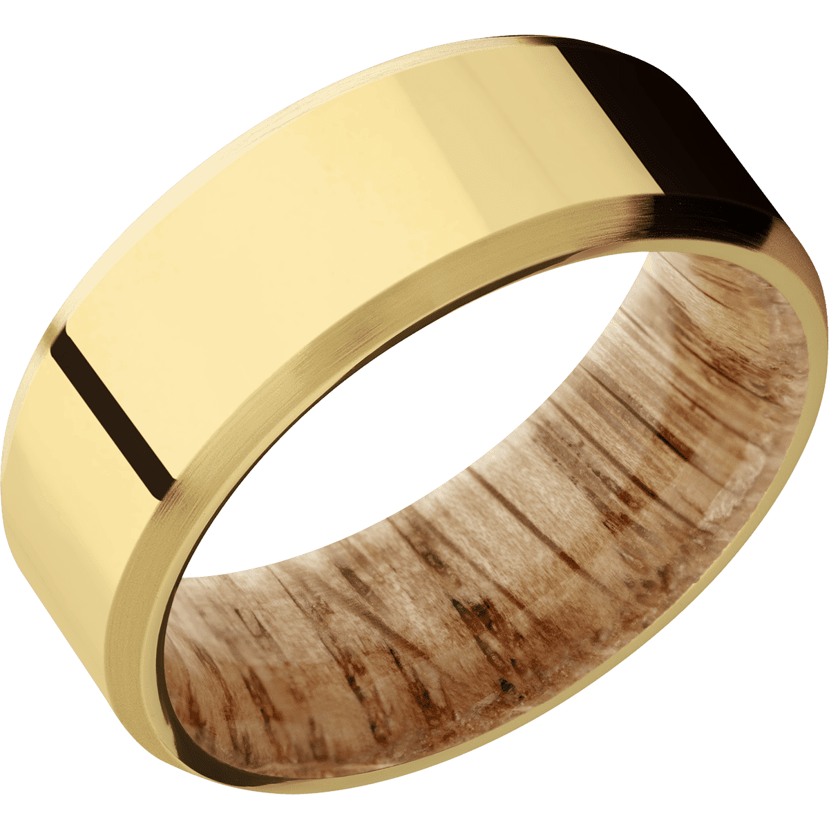 8 mm wide Beveled 14K Yellow Gold band featuring a Natural Oak sleeve.