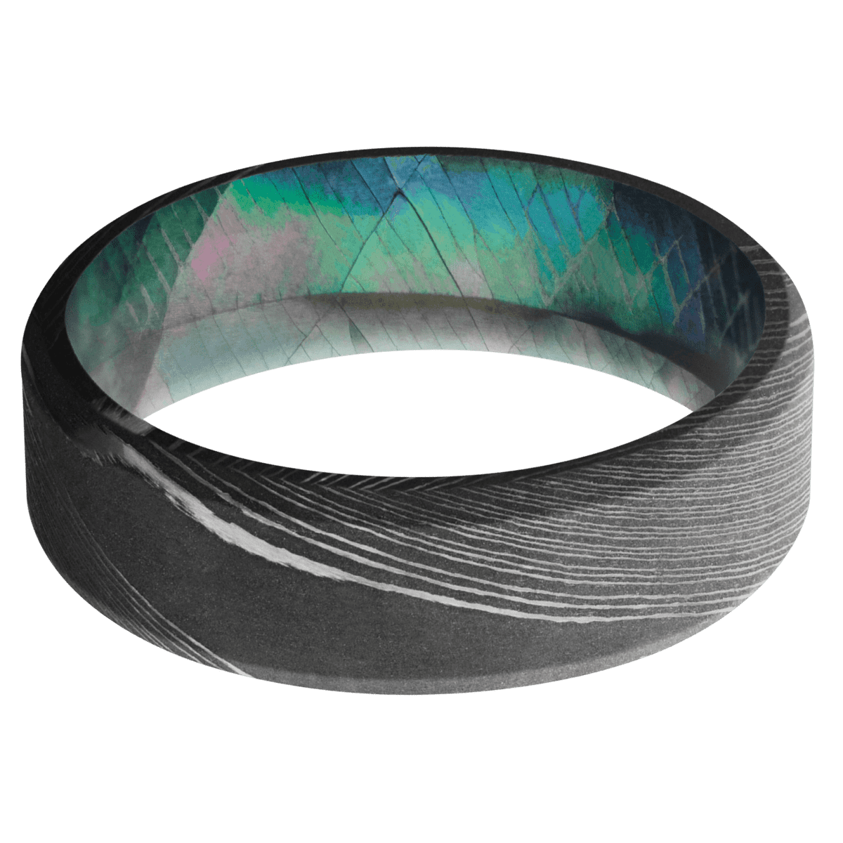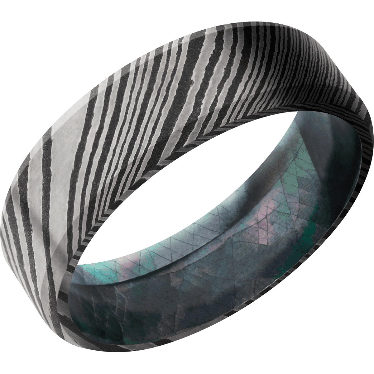 7 mm wide Beveled Damascus band featuring a Black Mother of Pearl sleeve.
