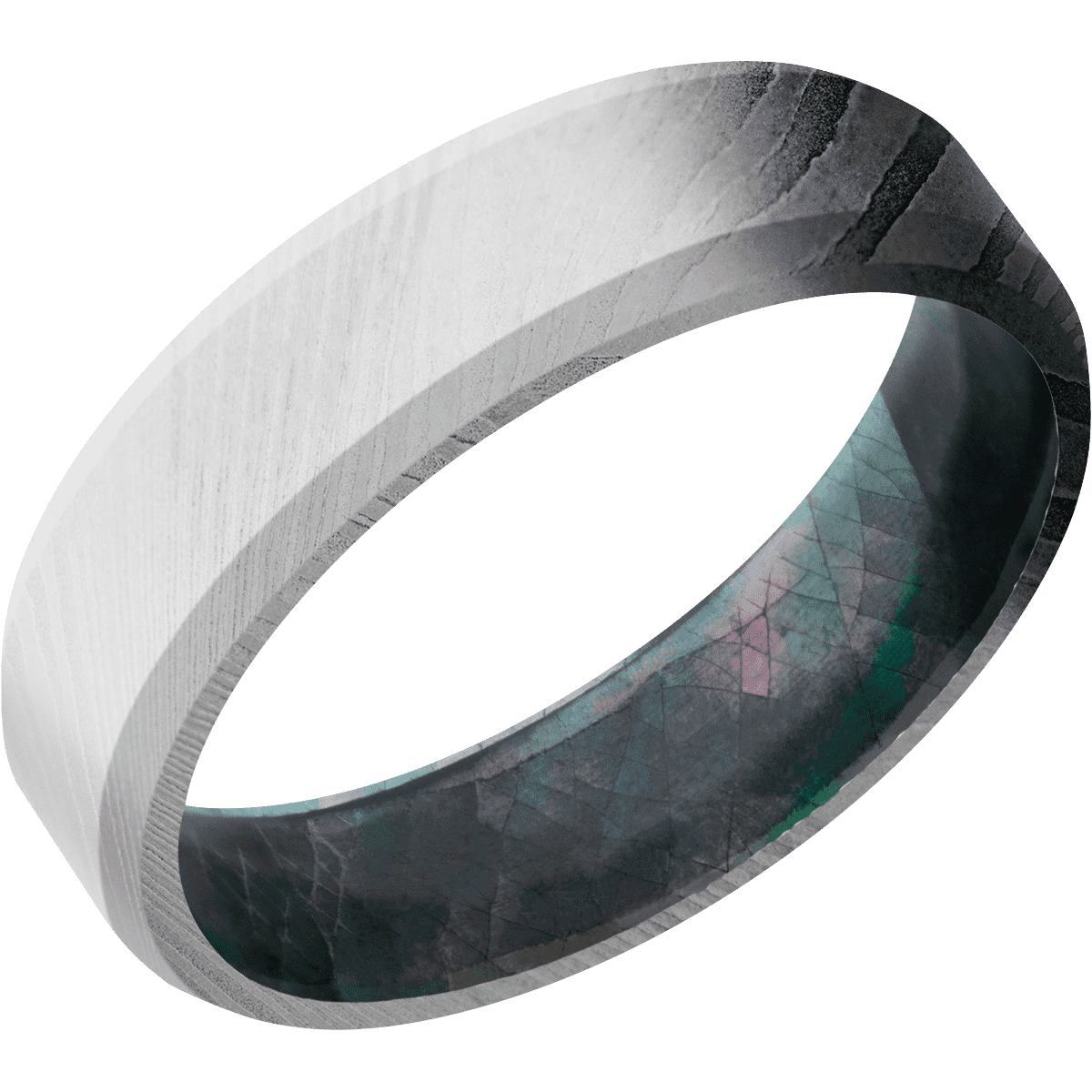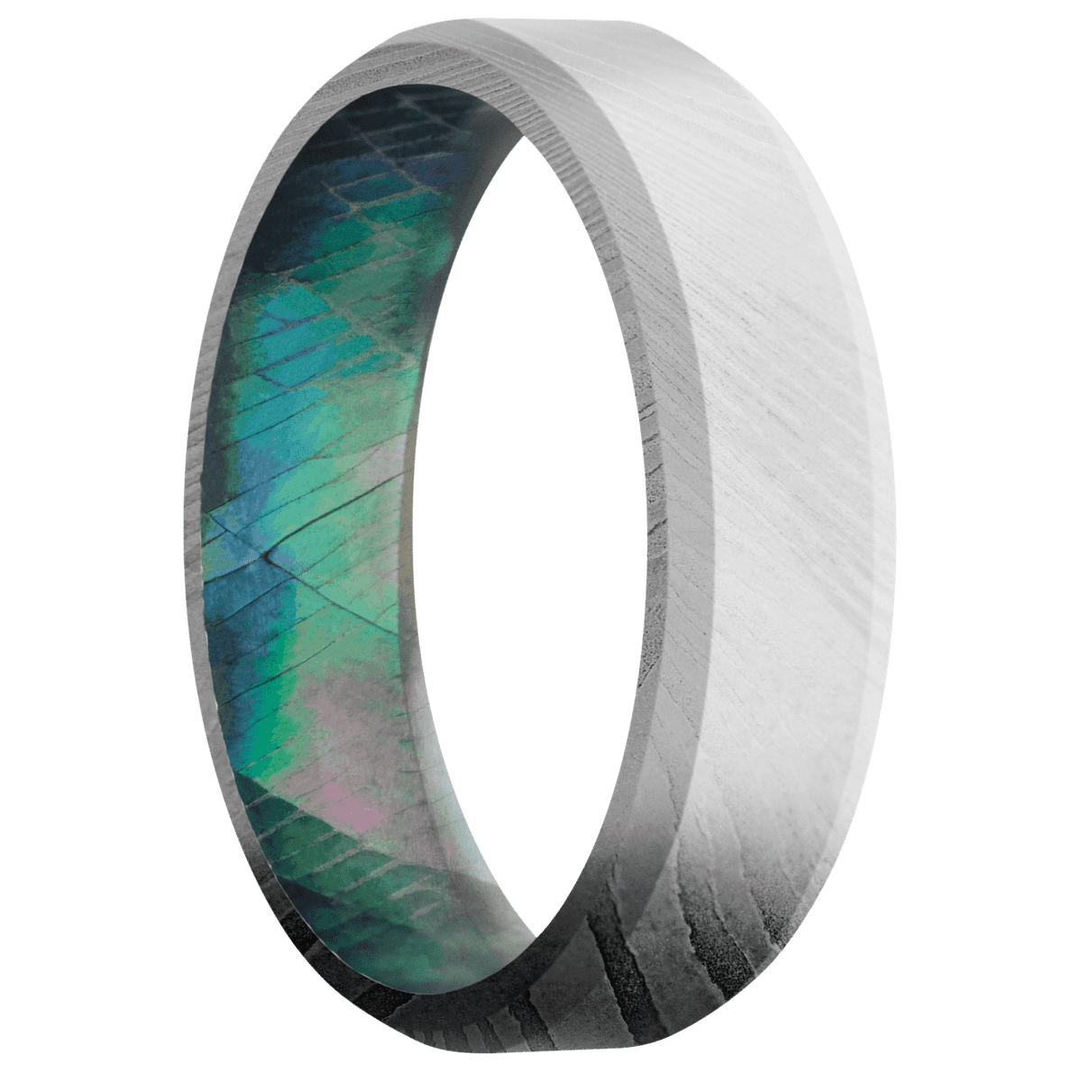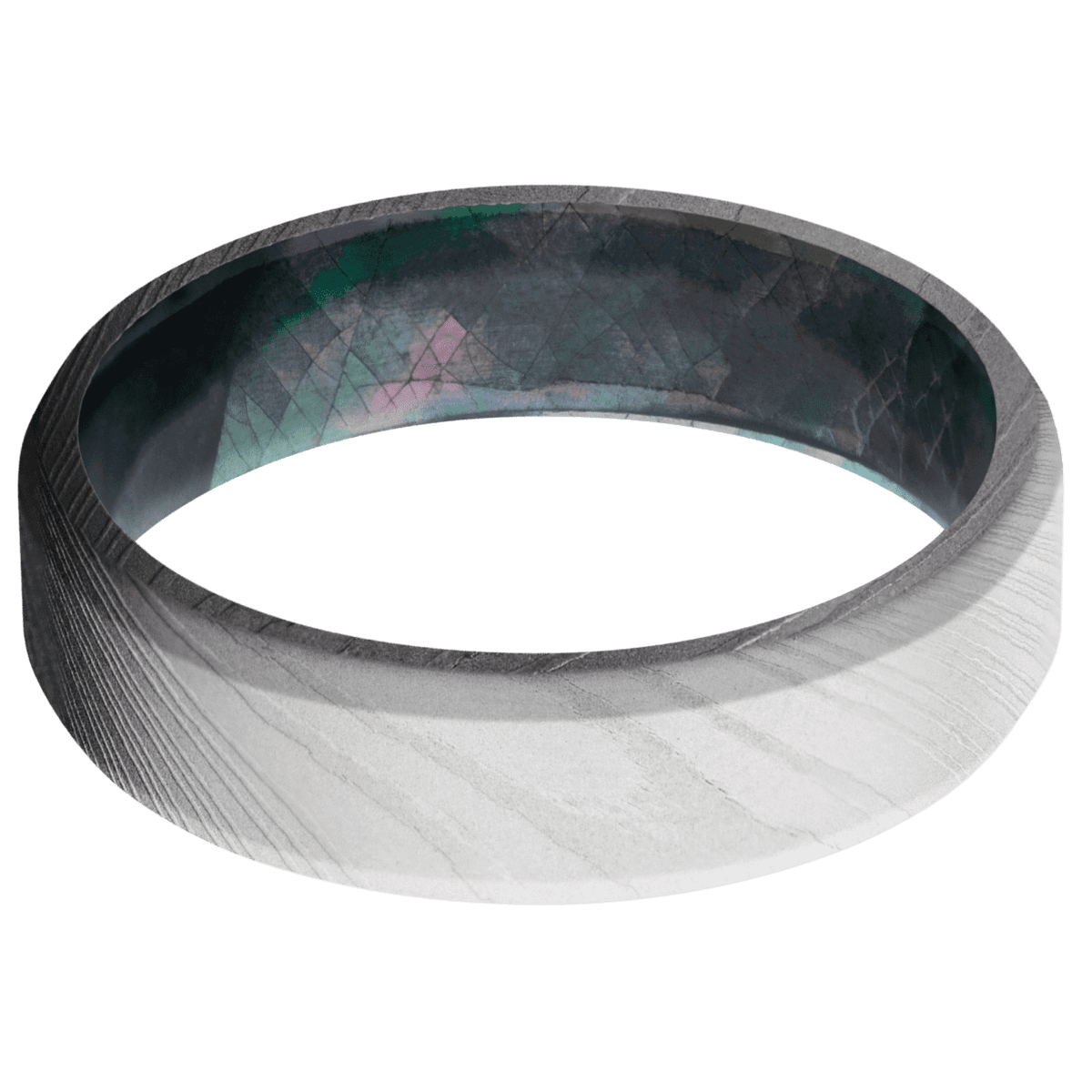 6 mm wide Beveled Damascus band featuring a Black Mother of Pearl sleeve.