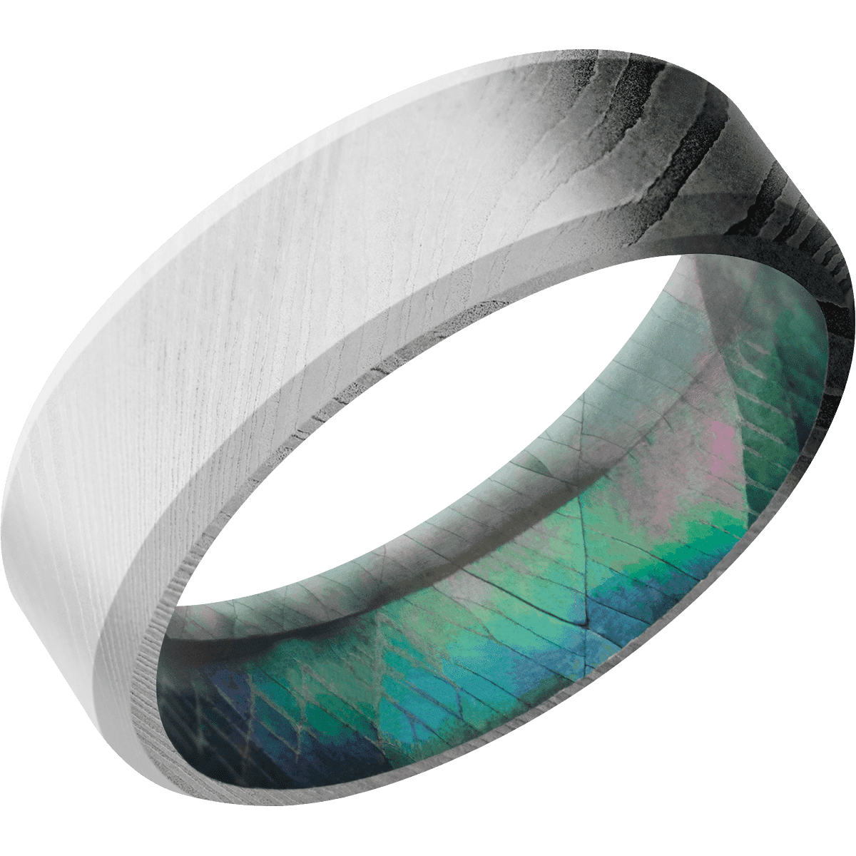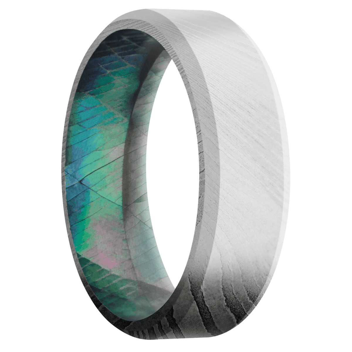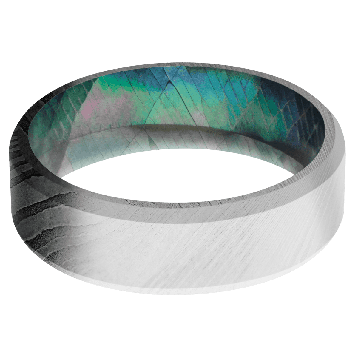 7 mm wide Beveled Damascus band featuring a Black Mother of Pearl sleeve.