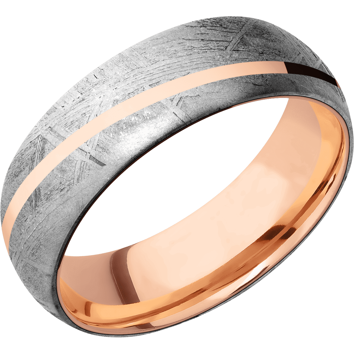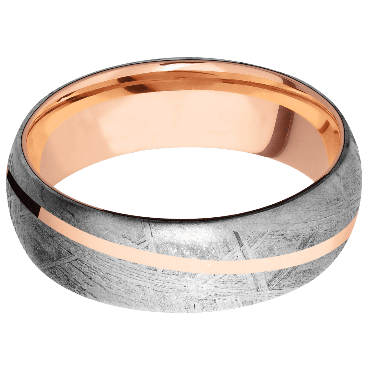 7 mm wide/Domed/Meteorite band with one 1 mm Angled inlay of 14K Rose Gold also featuring a 14K Rose Gold sleeve.