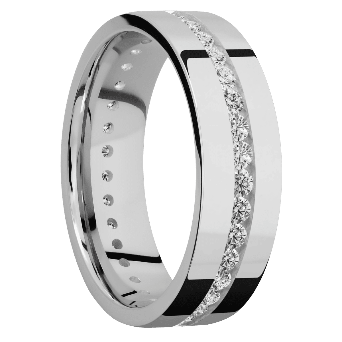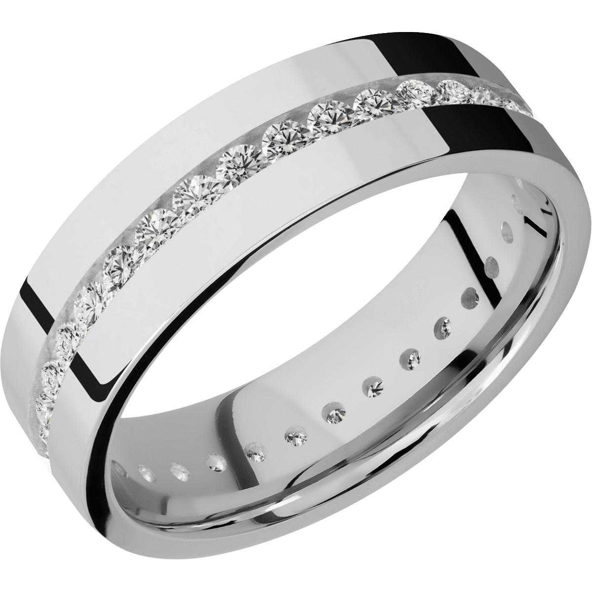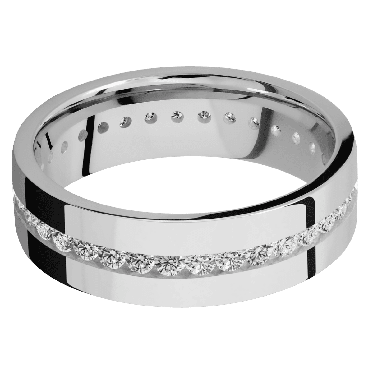 7 mm wide/Flat/Platinum band with an Eternity arrangement of .03 carat Round Lab Grown Diamond (ST) stones in a Channel setting.