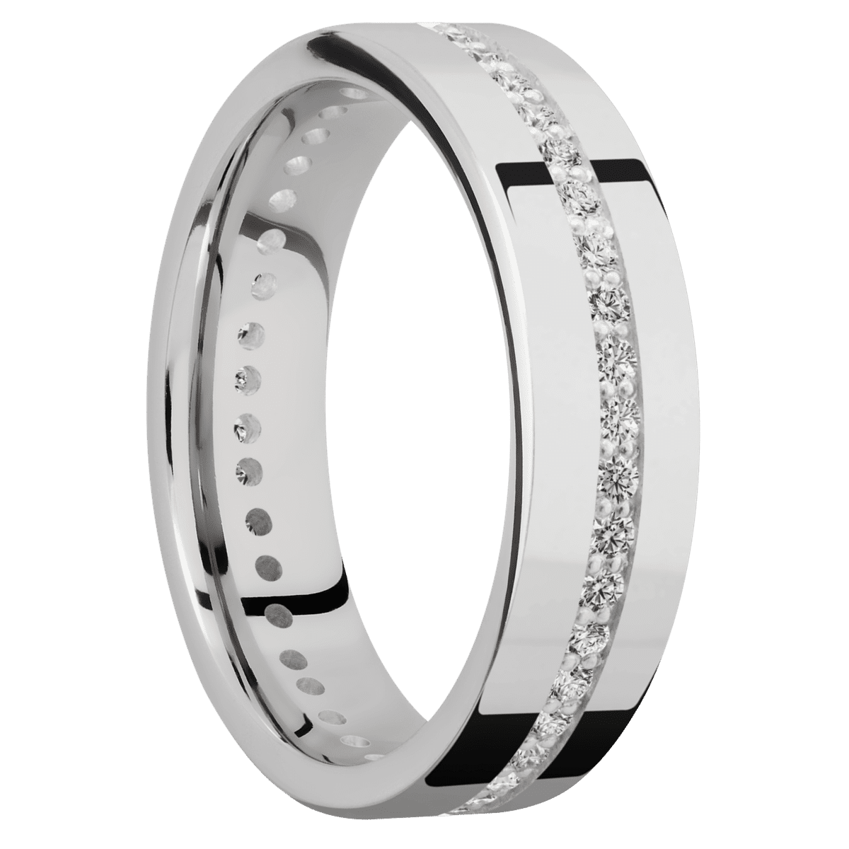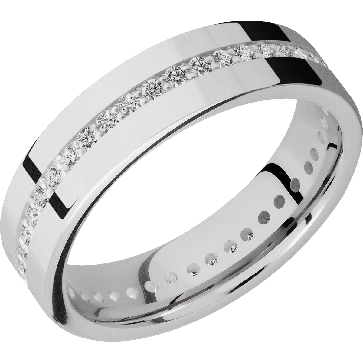 6 mm wide/Flat/Platinum band with an Eternity arrangement of .015 carat Round Lab Grown Diamond (ST) stones in a Bead Channel setting.