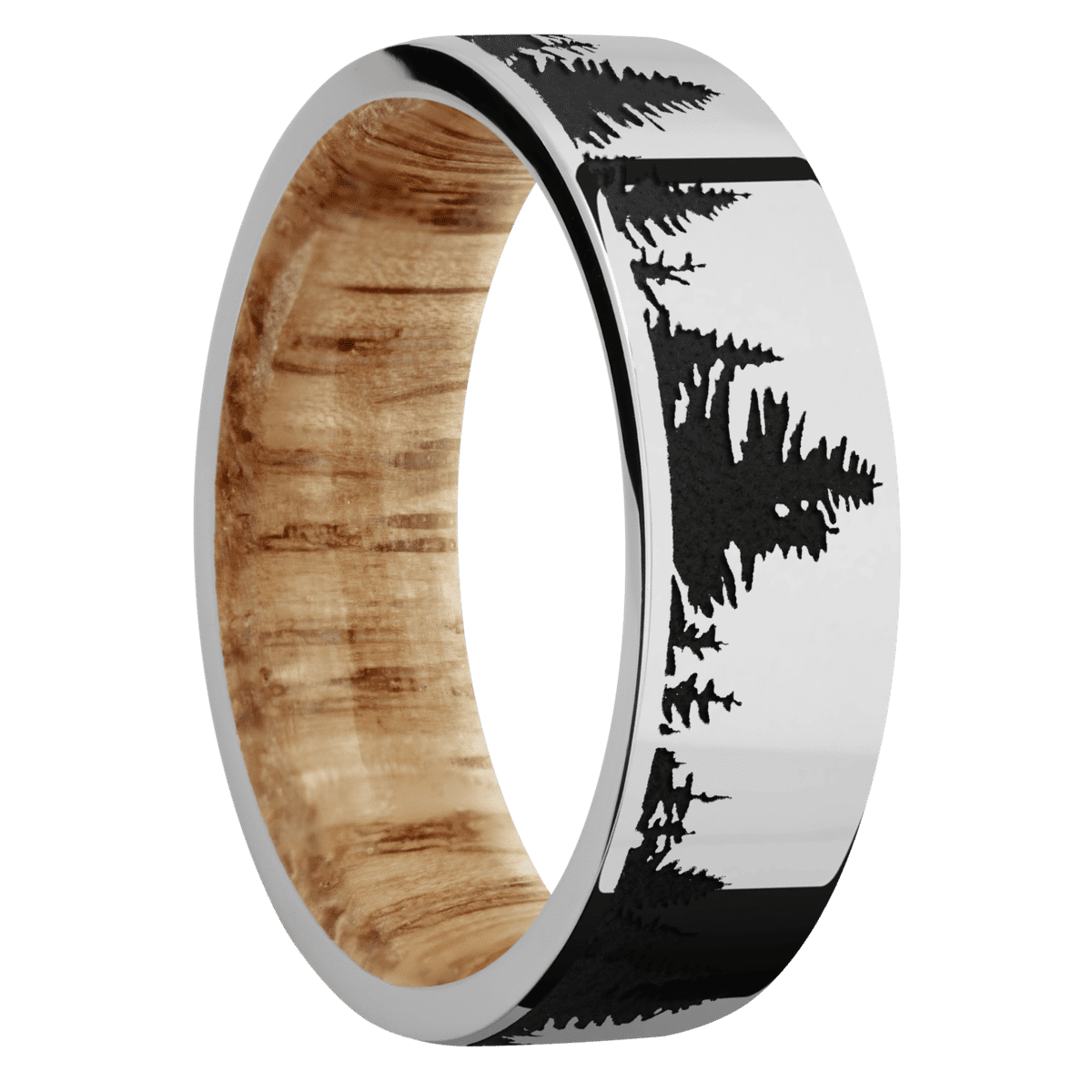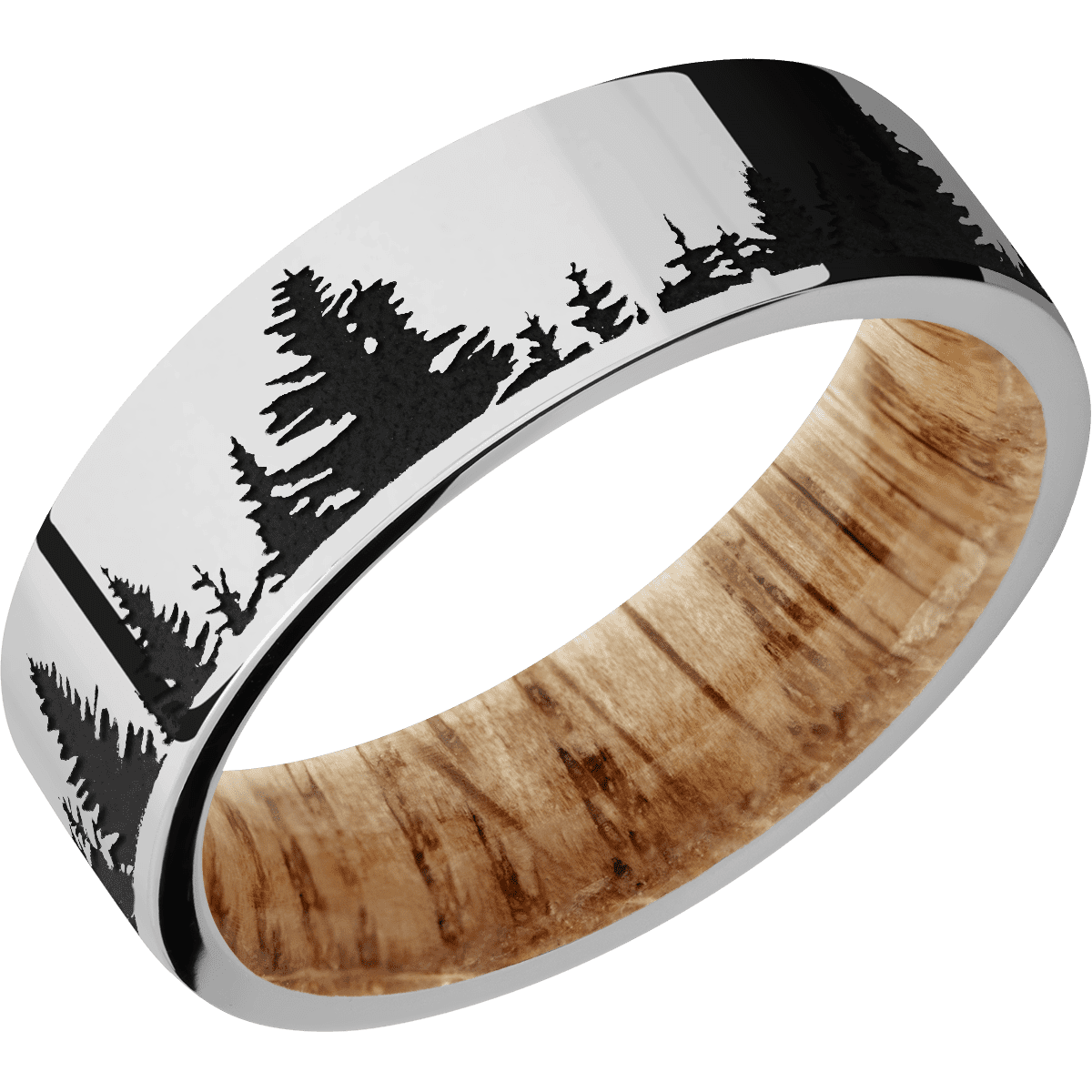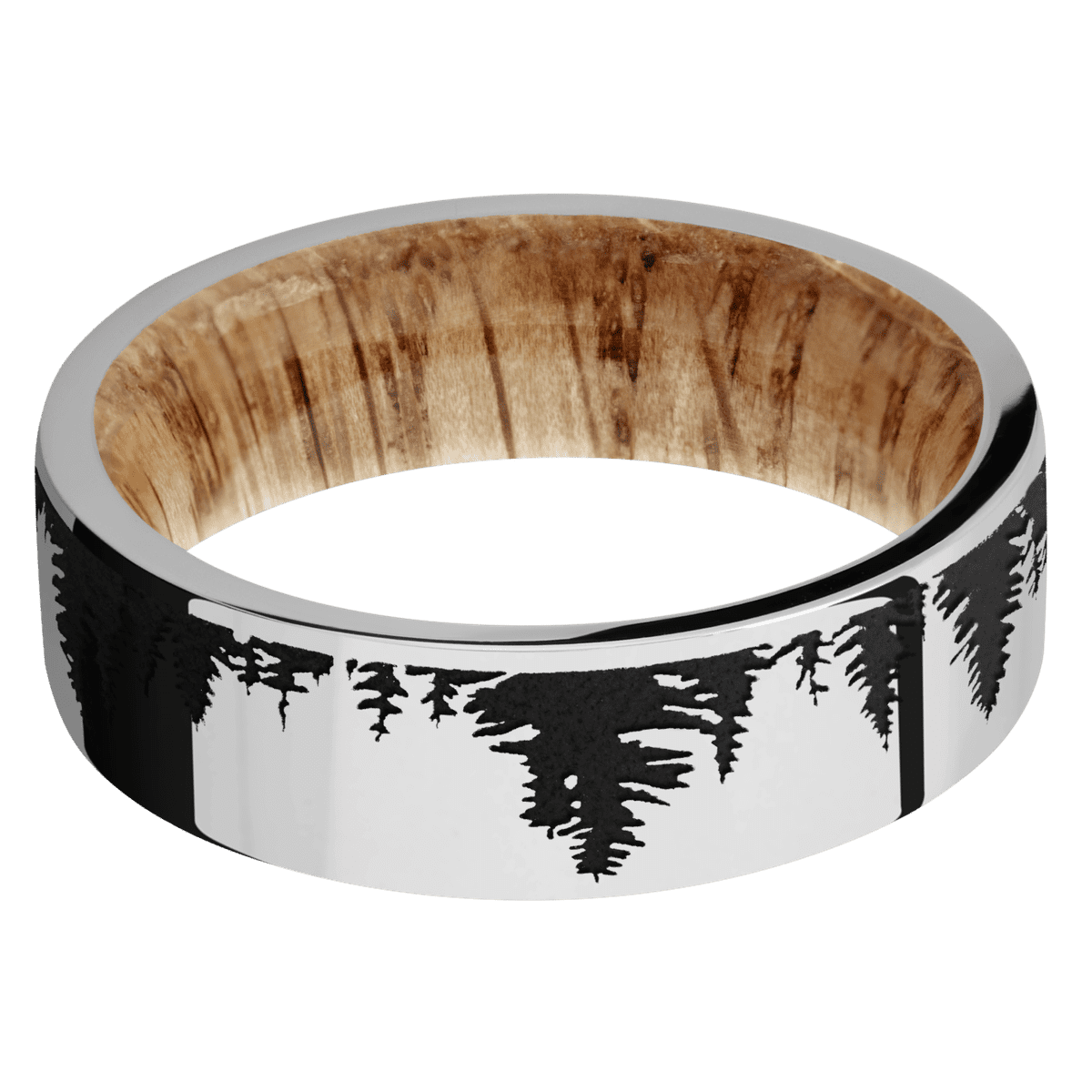 7 mm wide/Flat/Platinum band with a laser carved Trees pattern also featuring a Natural Oak sleeve.