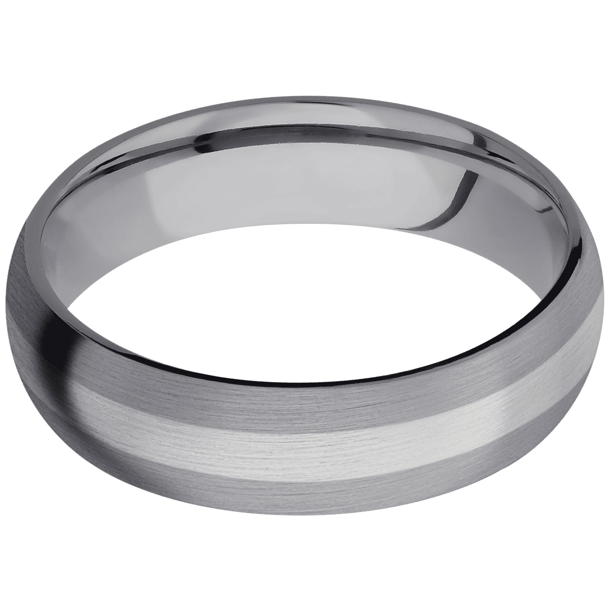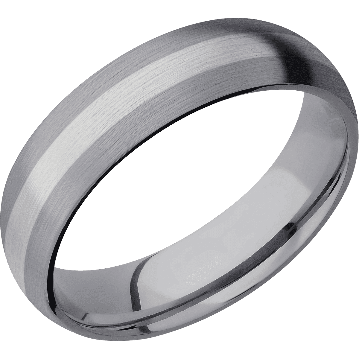 6 mm wide/Domed/Tantalum band with one 2 mm Centered inlay of Palladium Silver.