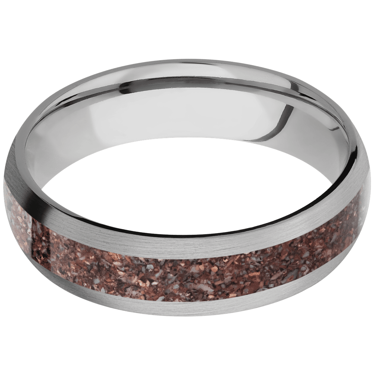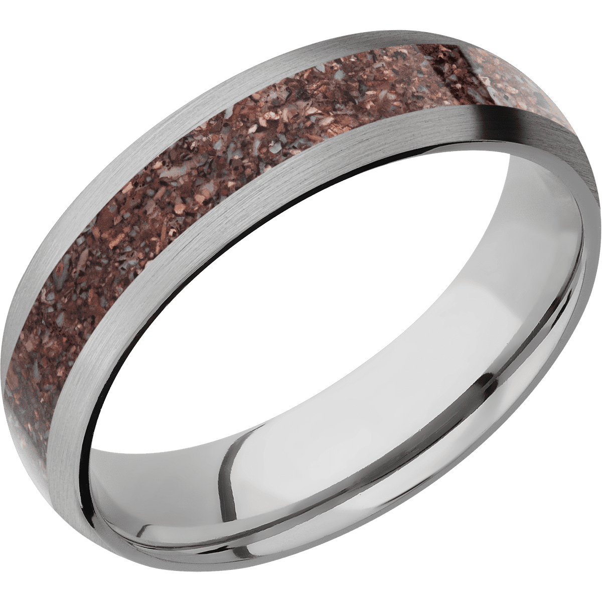 6 mm wide/Domed/Titanium band with one 3 mm Centered inlay of Dinosaur Bone Mixed.