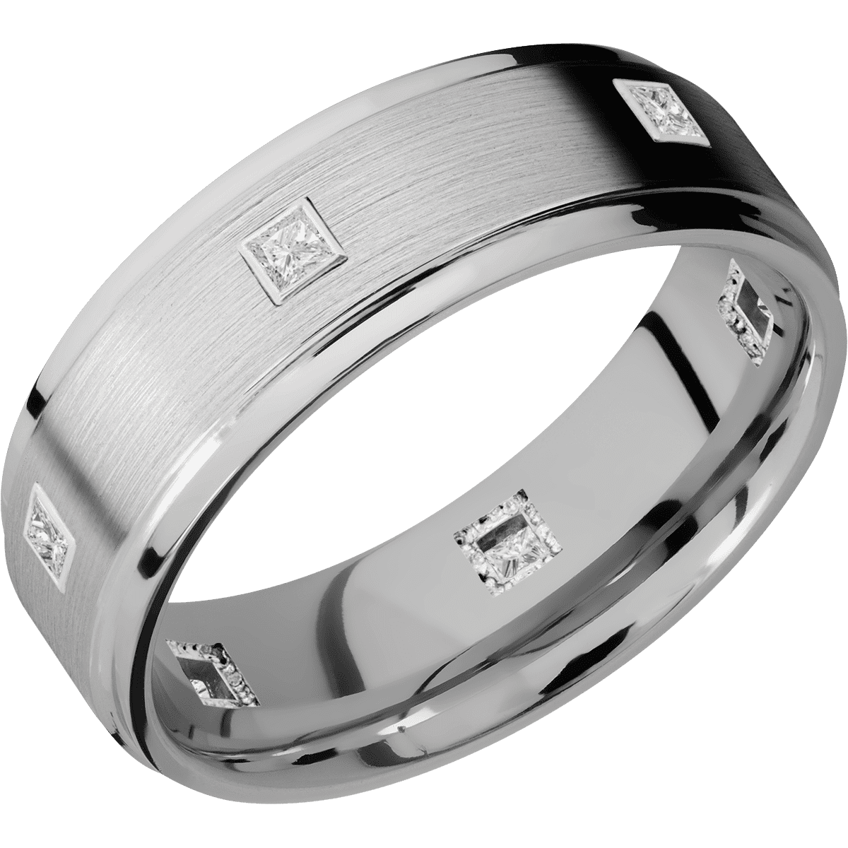 7 mm wide/Flat Grooved Edges/Titanium band with a 6X Even arrangement of .06 carat Princess Lab Grown Diamond (ST) stones in a Bezel setting.