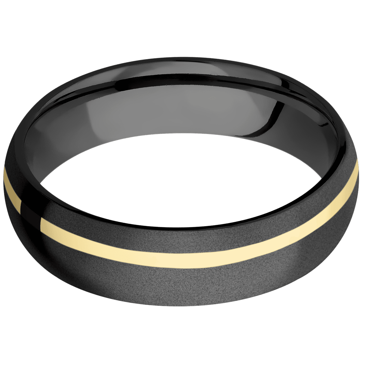 6 mm wide/Domed/Zirconium band with one 1 mm Off Center inlay of 14K Yellow Gold.
