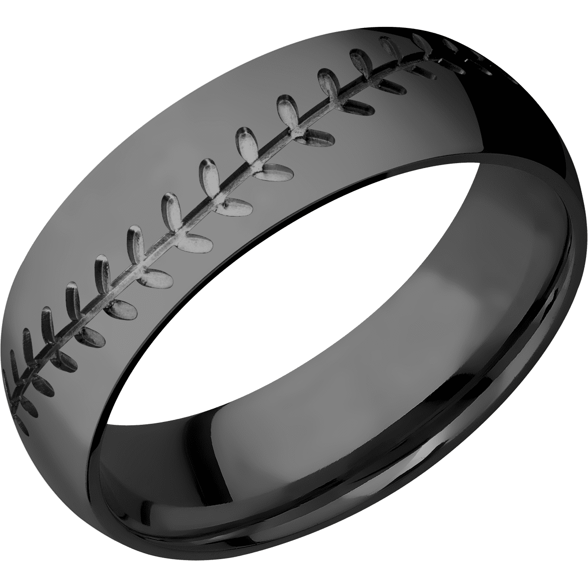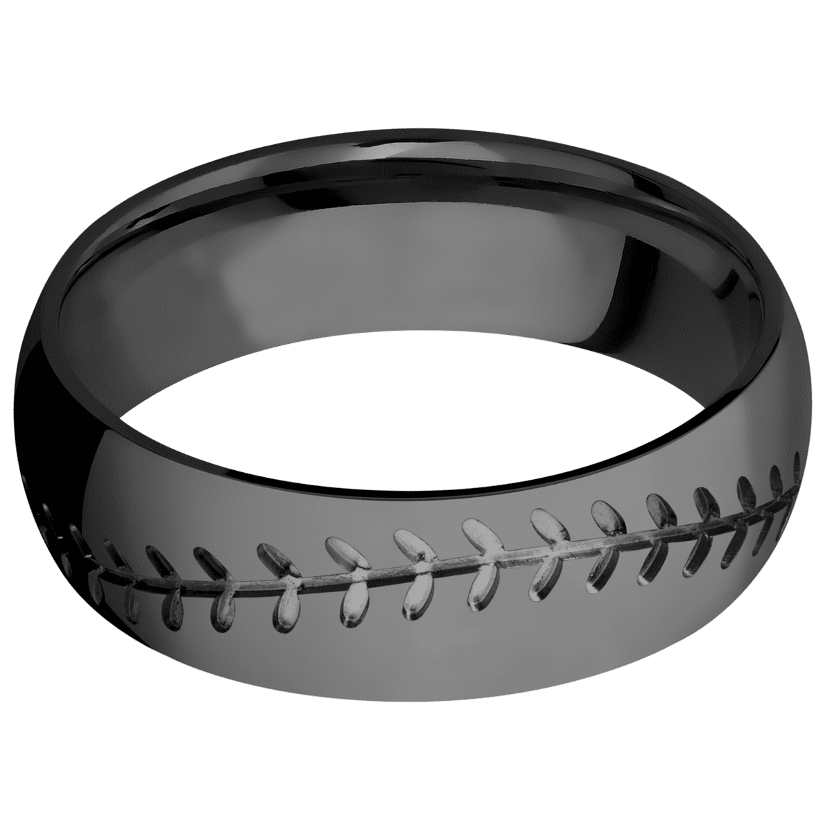 7 mm wide/Domed/Zirconium band with a machined Baseball pattern.