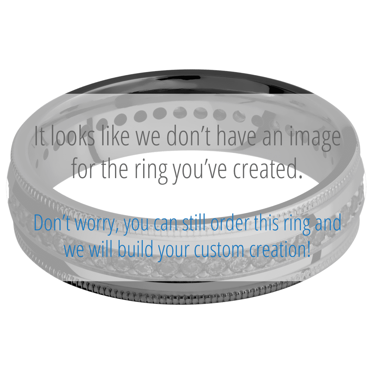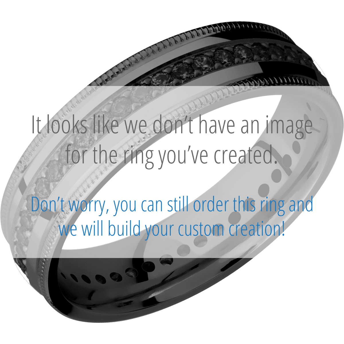 6 mm wide/Domed Milgrain Edges/Zirconium band with an Eternity arrangement of .015 carat Round Lab Blue Diamond stones in a Bead setting.