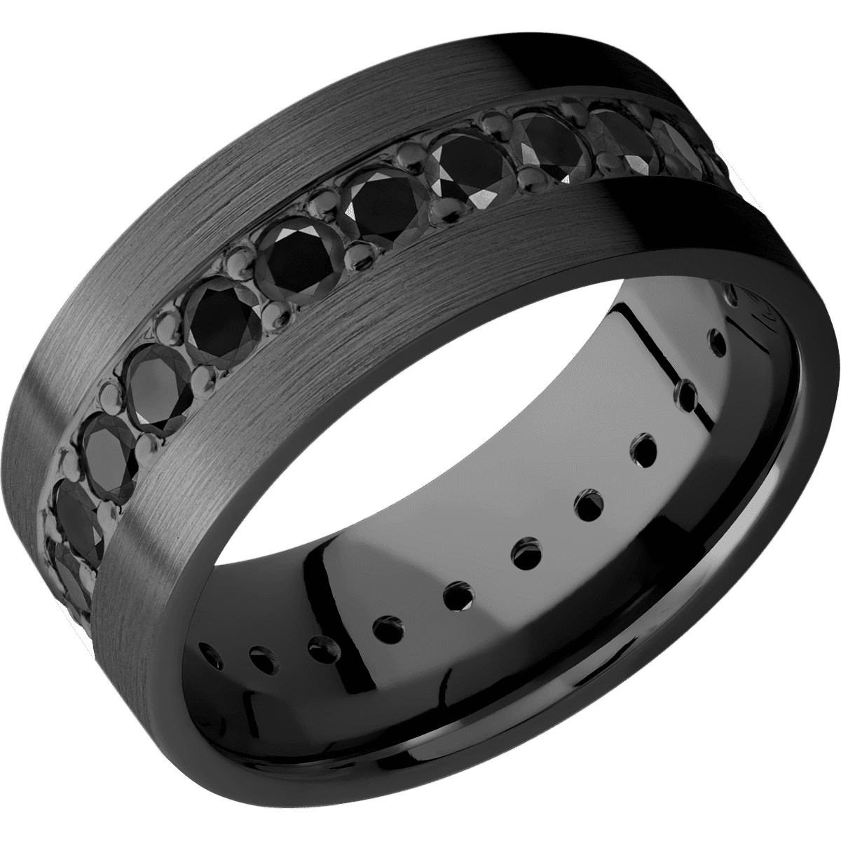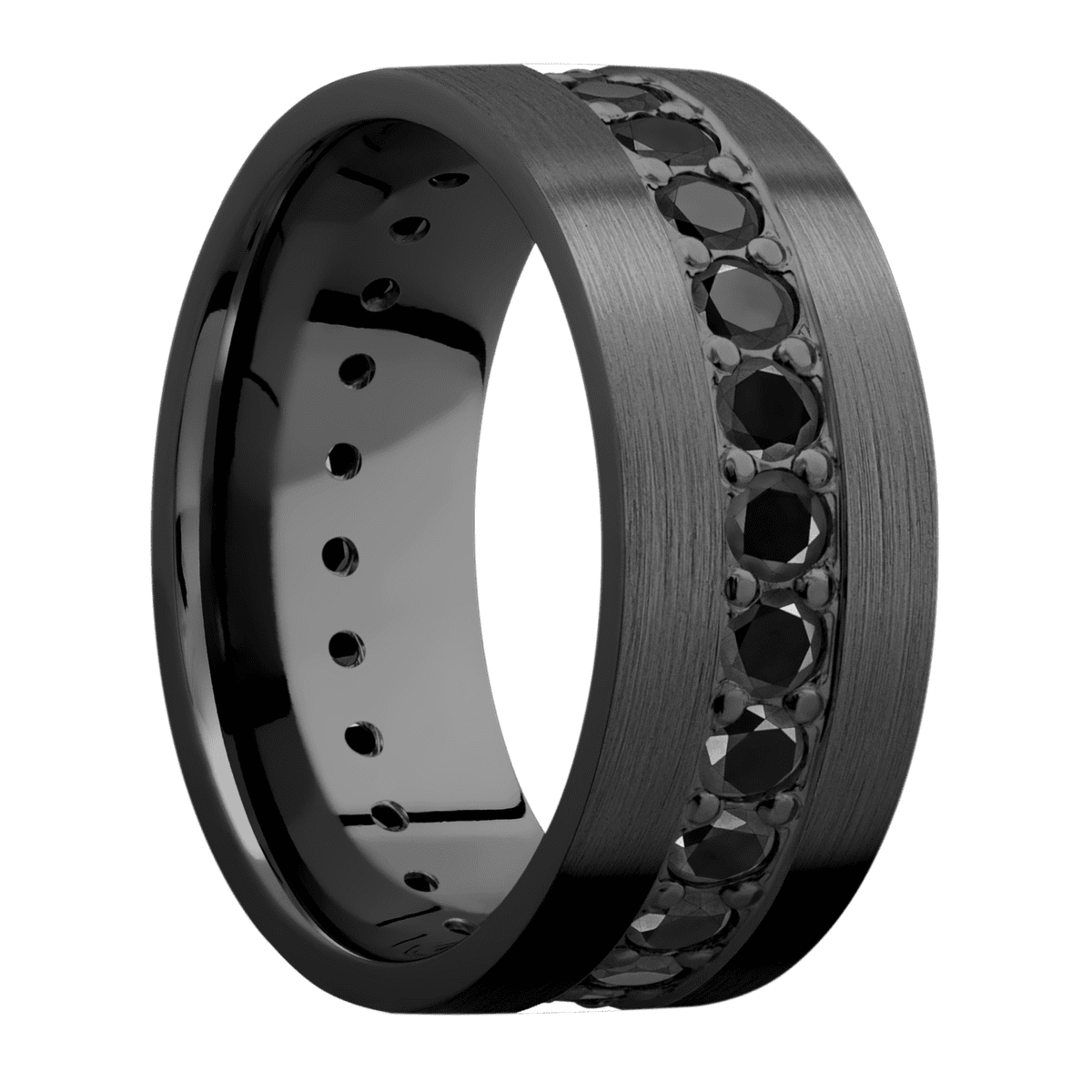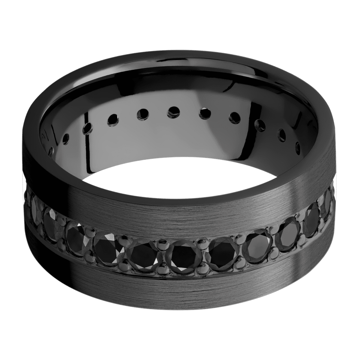 9 mm wide/Flat/Zirconium band with an Eternity arrangement of .07 carat Round Black Diamond stones in a Bead setting.