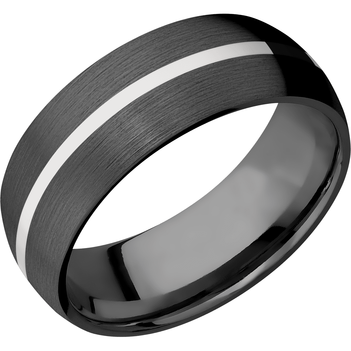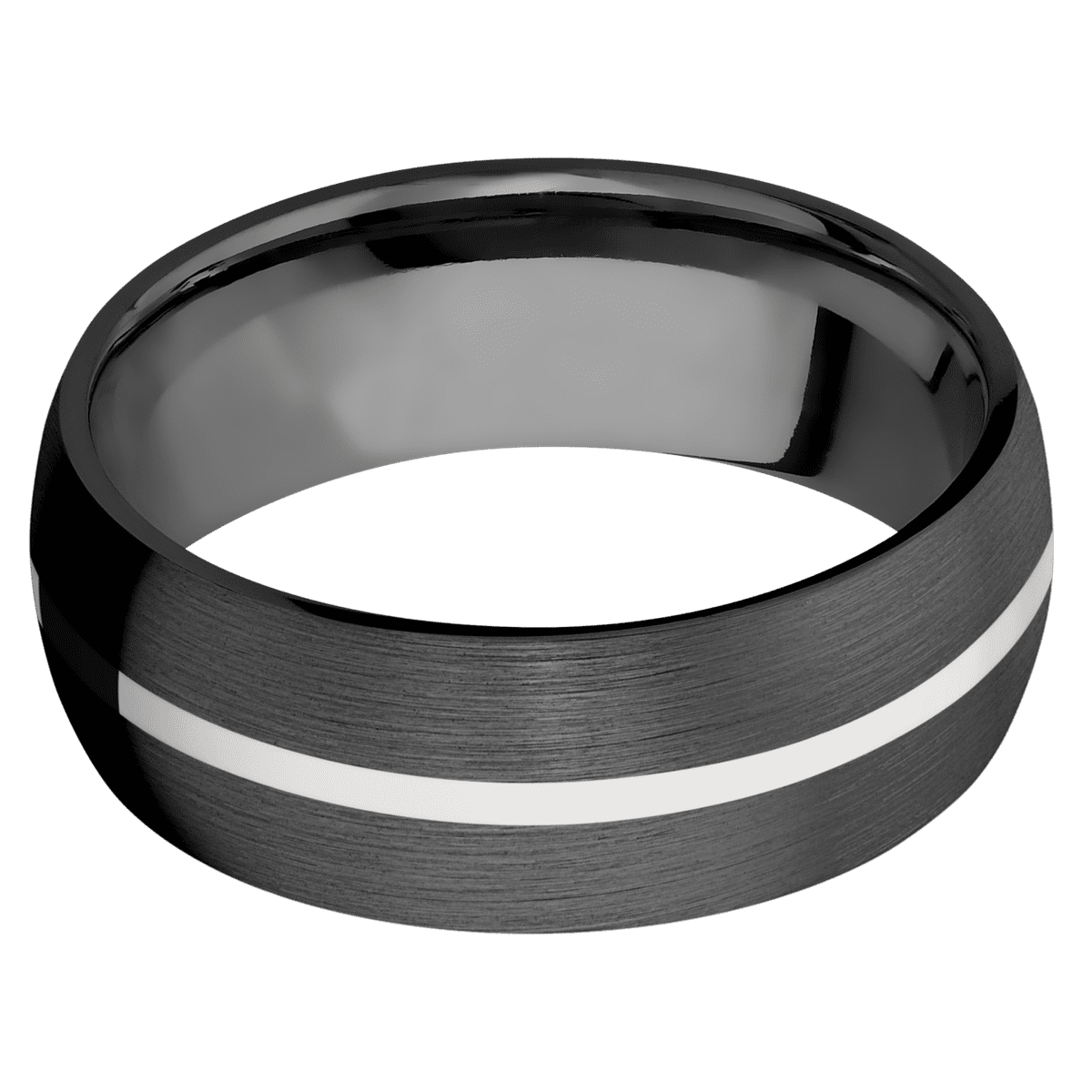8 mm wide/Domed/Zirconium band with one 1 mm Centered inlay of 14K White Gold.