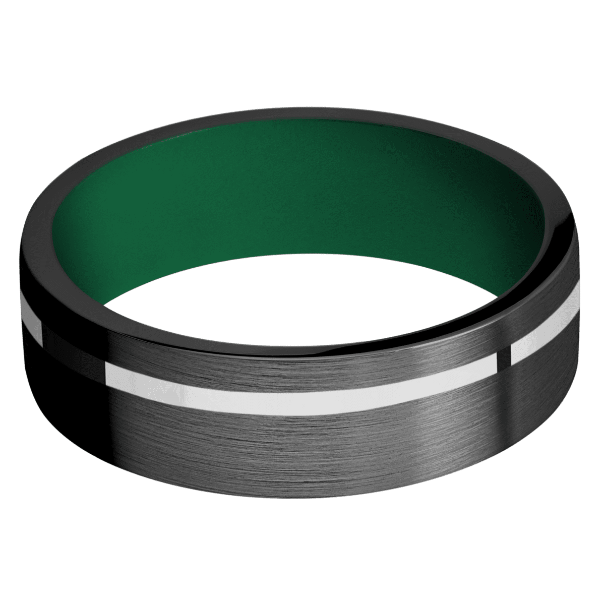 7 mm wide/Flat/Zirconium band with one 1 mm Off Center inlay of 14K White Gold also featuring a Green sleeve.
