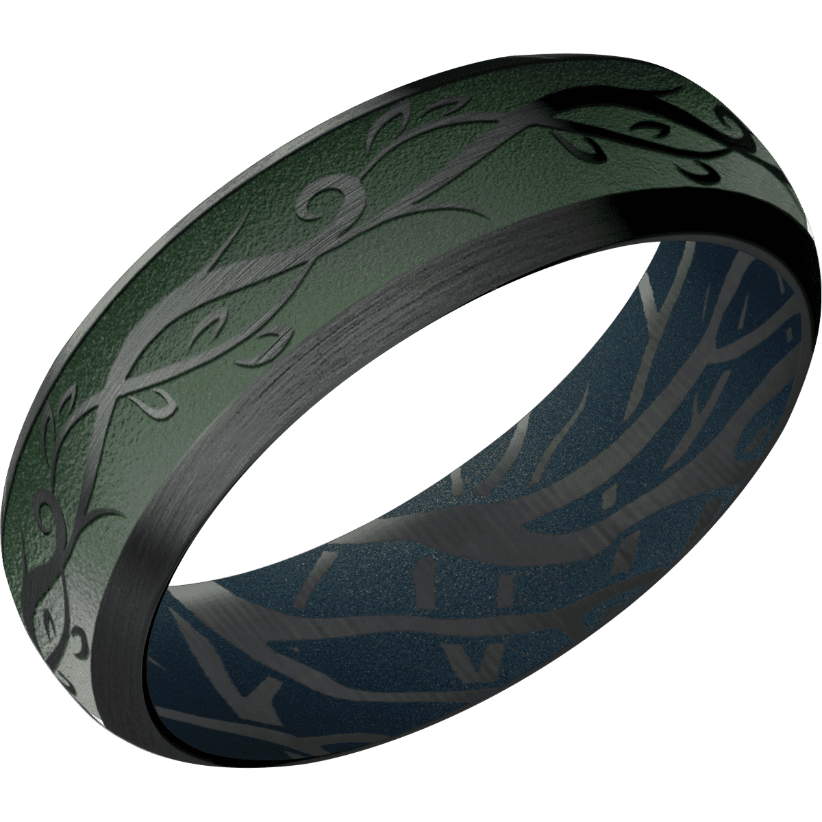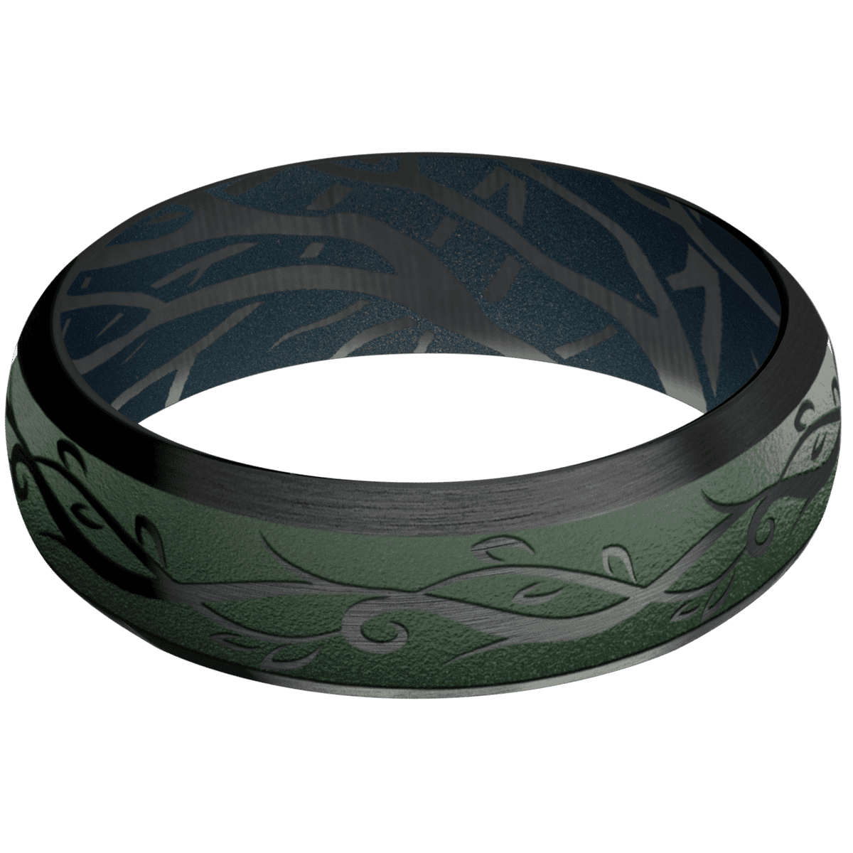 7 mm wide/Domed Bevel/Zirconium band with a laser carved Vine pattern also featuring a Northern Lights sleeve.