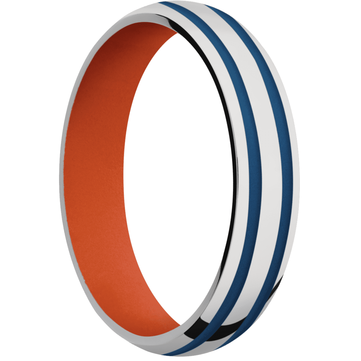 5 mm wide/Domed/Palladium Silver band with two 1 mm Double inlays of Ridgeway Blue also featuring a Hunter Orange sleeve.