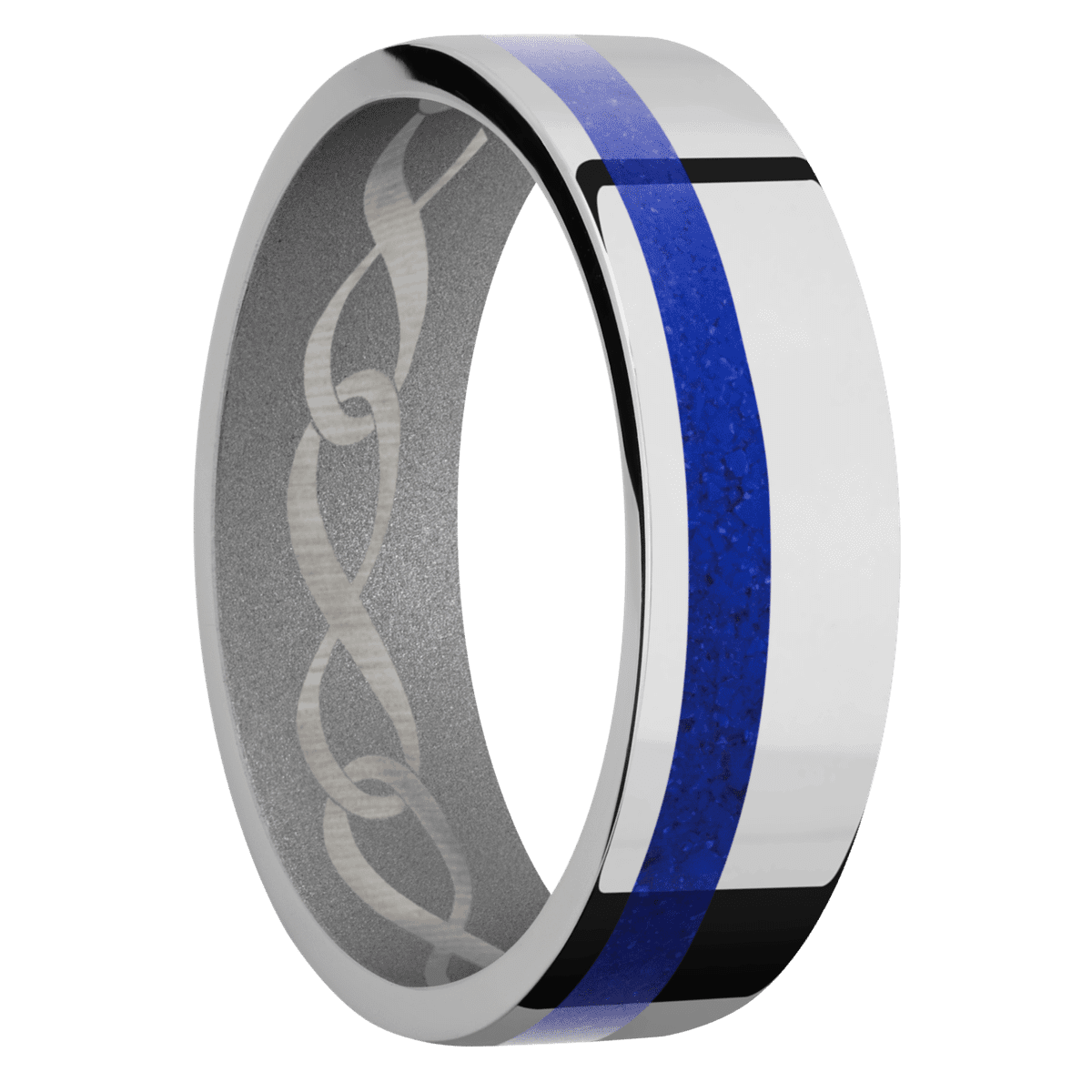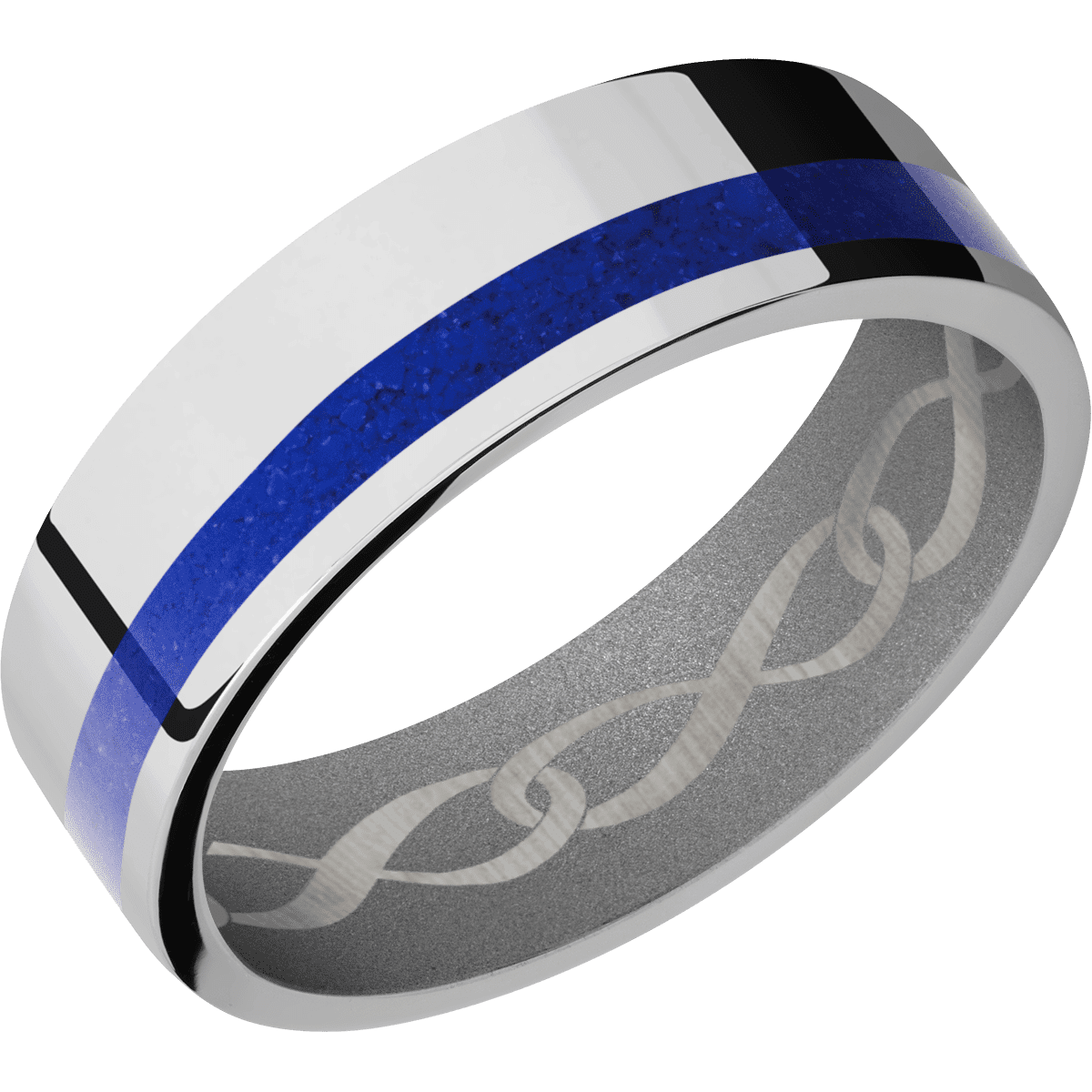 7 mm wide/Flat/Palladium Silver band with one 2 mm Off Center inlay of Lapis also featuring a Crushed Silver sleeve.
