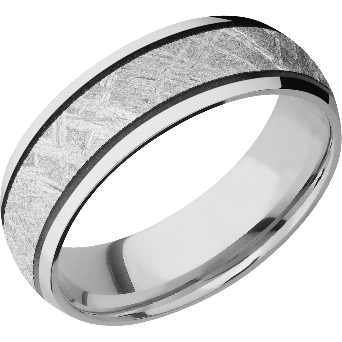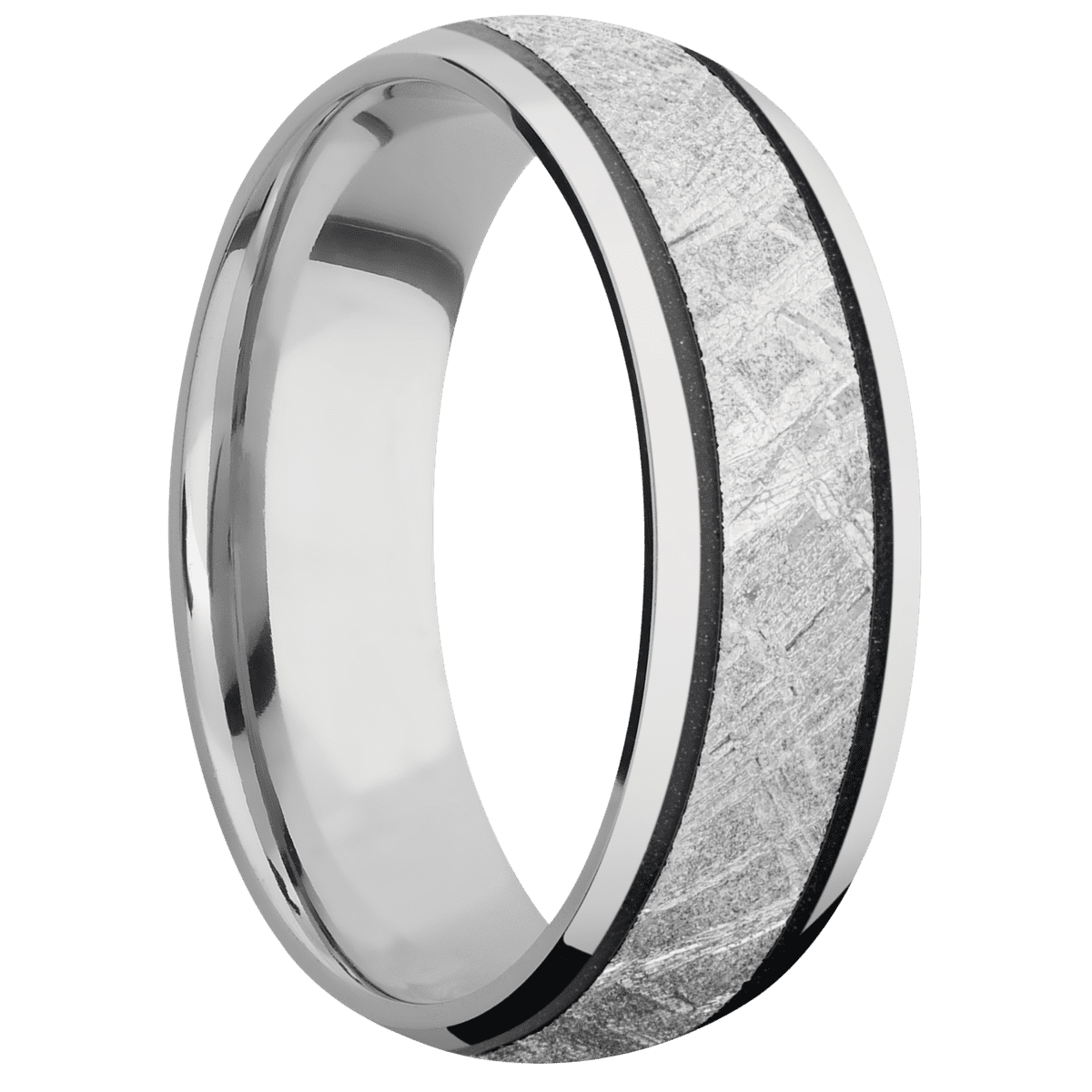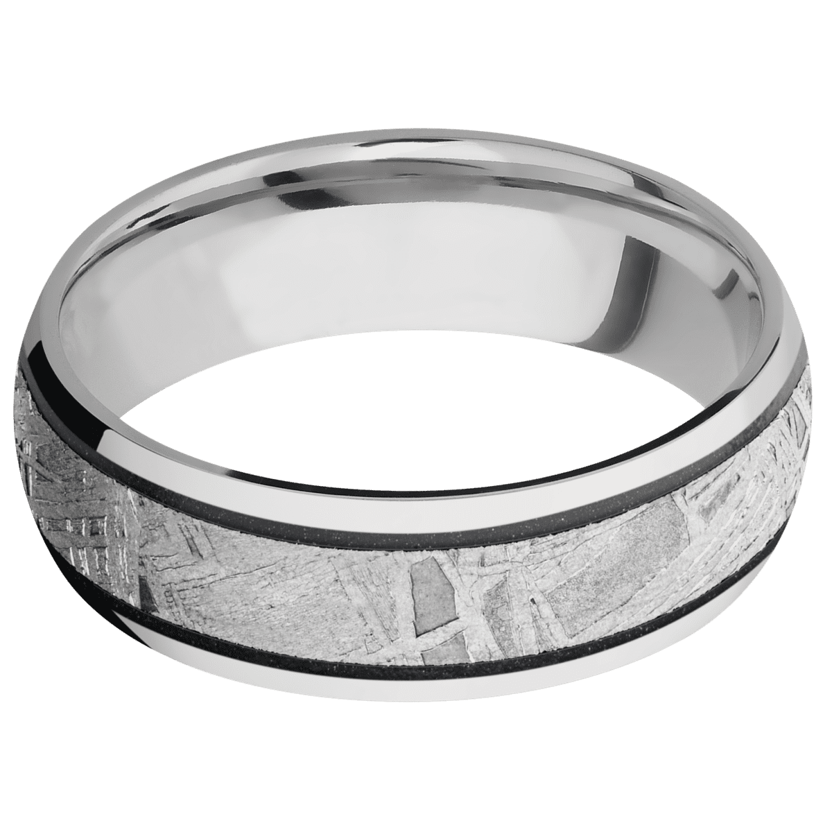 7 mm wide/Domed/14K White Gold band with one 4 mm Centered inlay of Meteorite.
