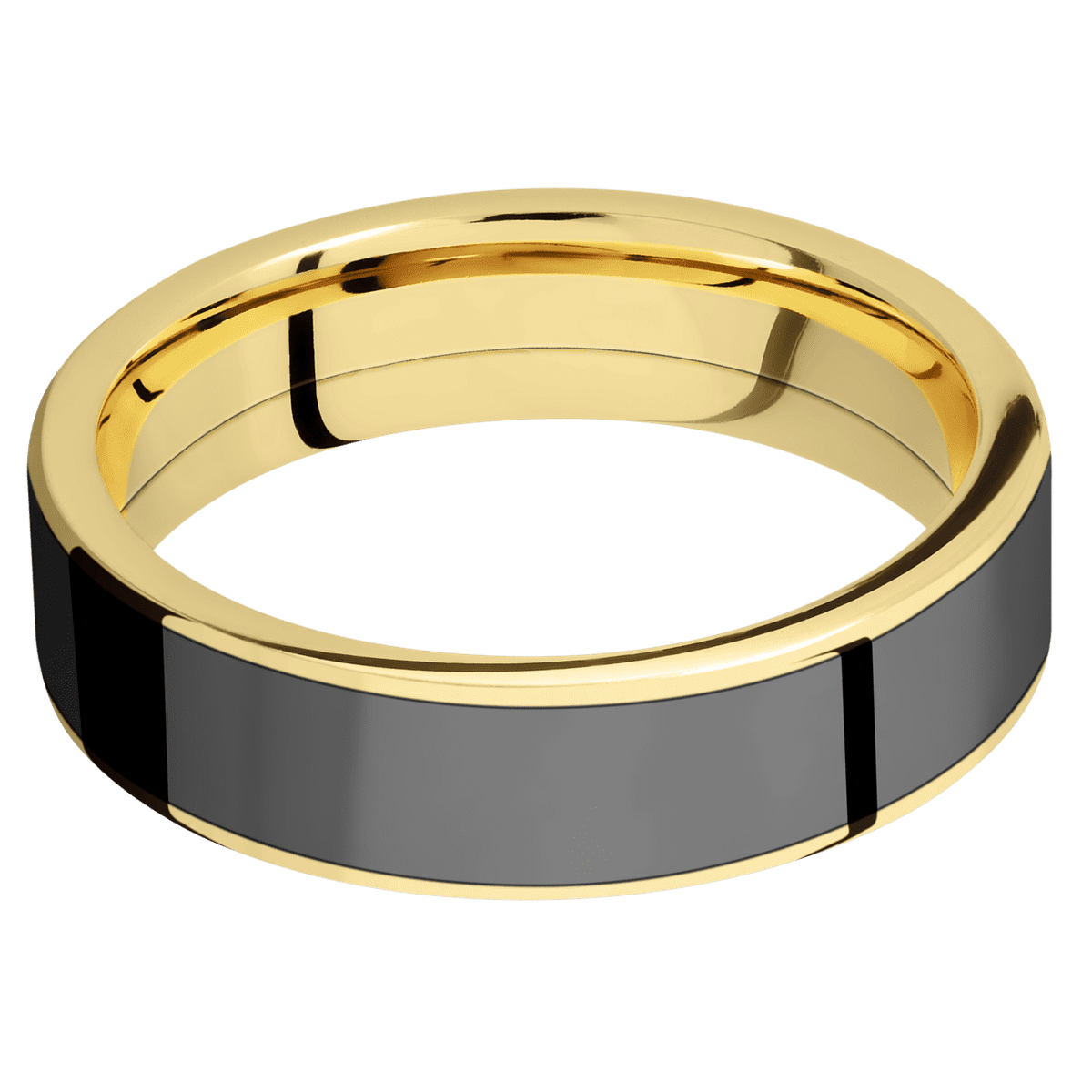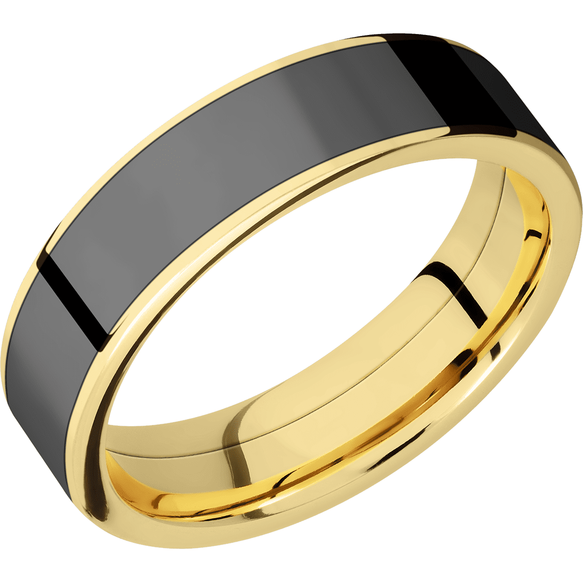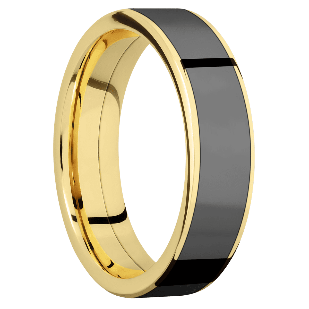 6 mm wide/Flat/14K Yellow Gold band with one 5 mm Centered inlay of Zirconium.