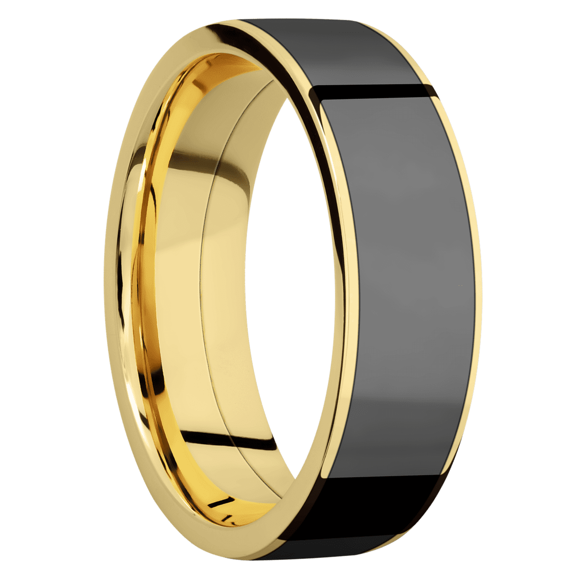 7 mm wide/Flat/14K Yellow Gold band with one 6 mm Centered inlay of Zirconium.