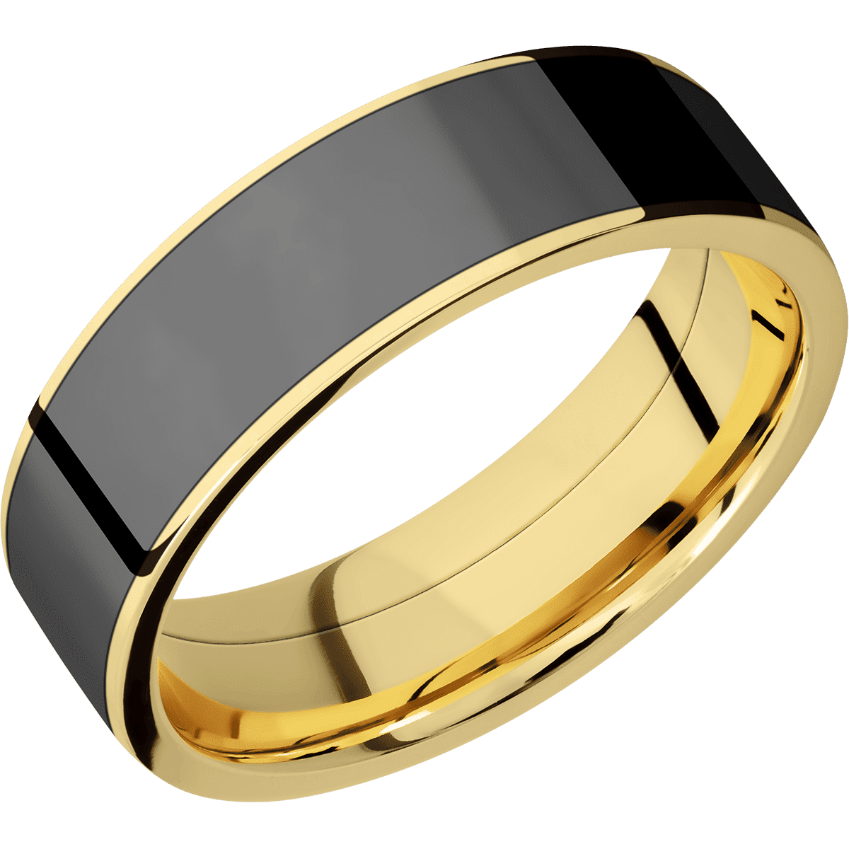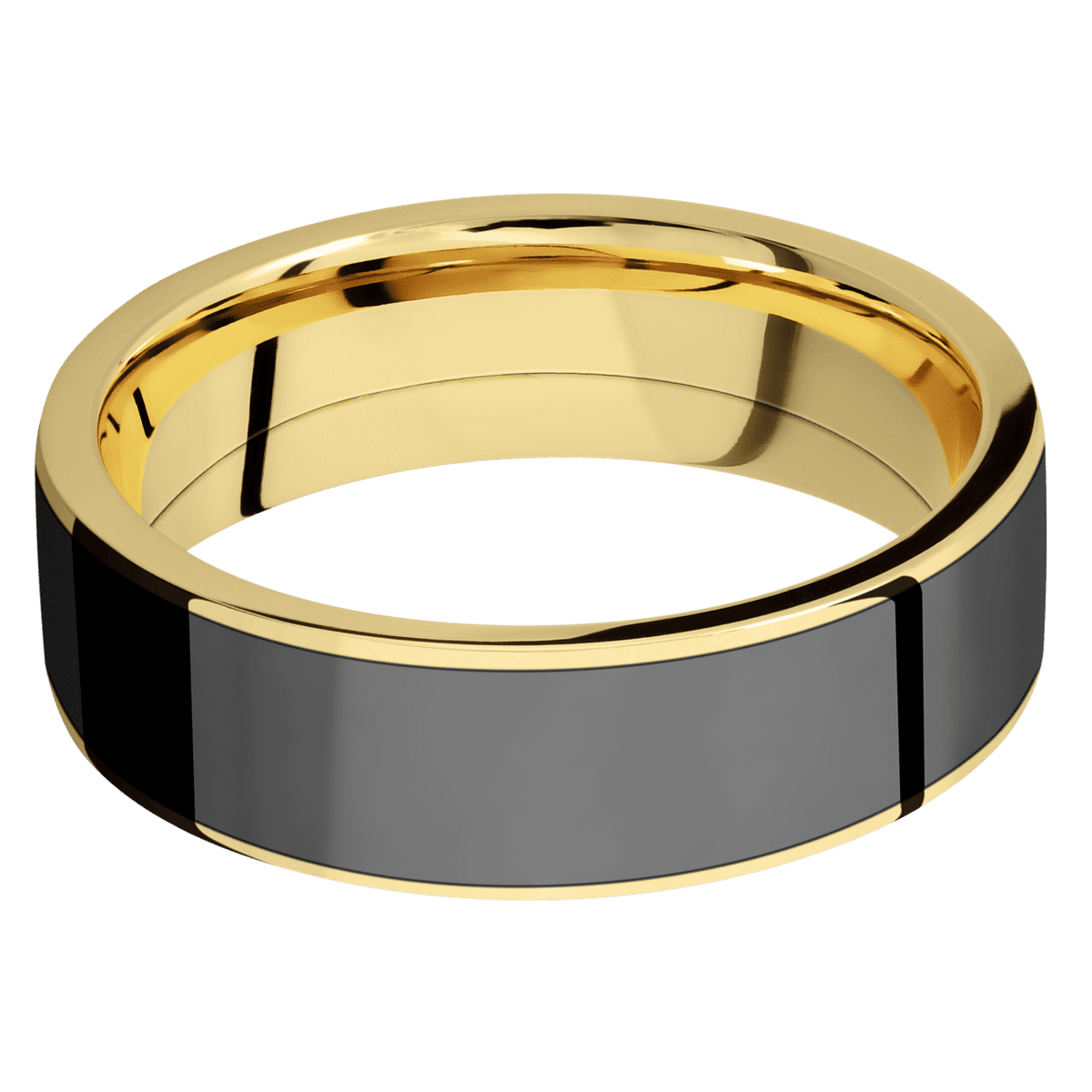 7 mm wide/Flat/14K Yellow Gold band with one 6 mm Centered inlay of Zirconium.