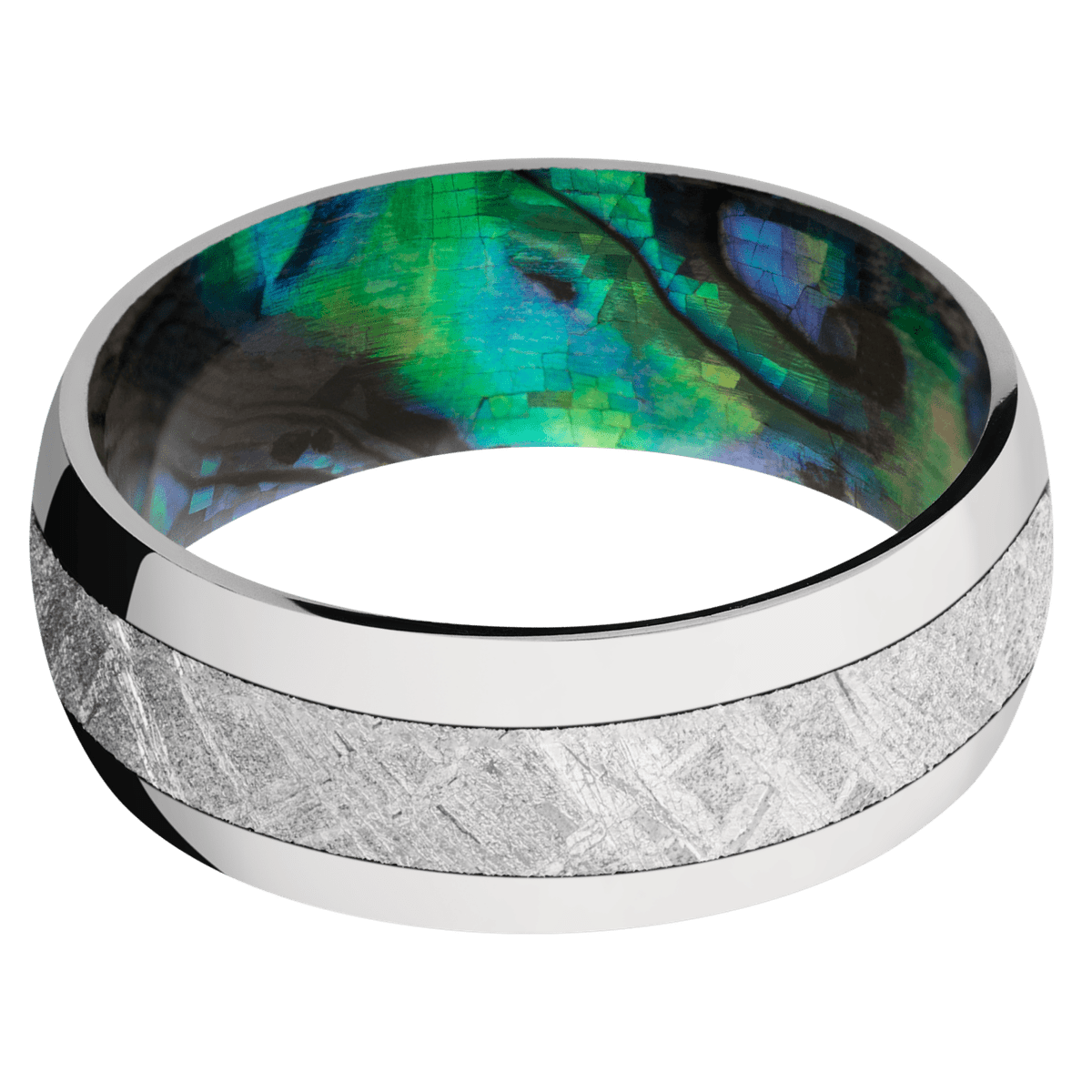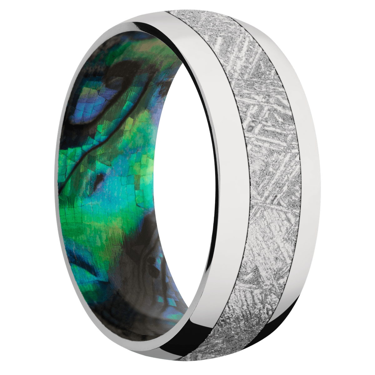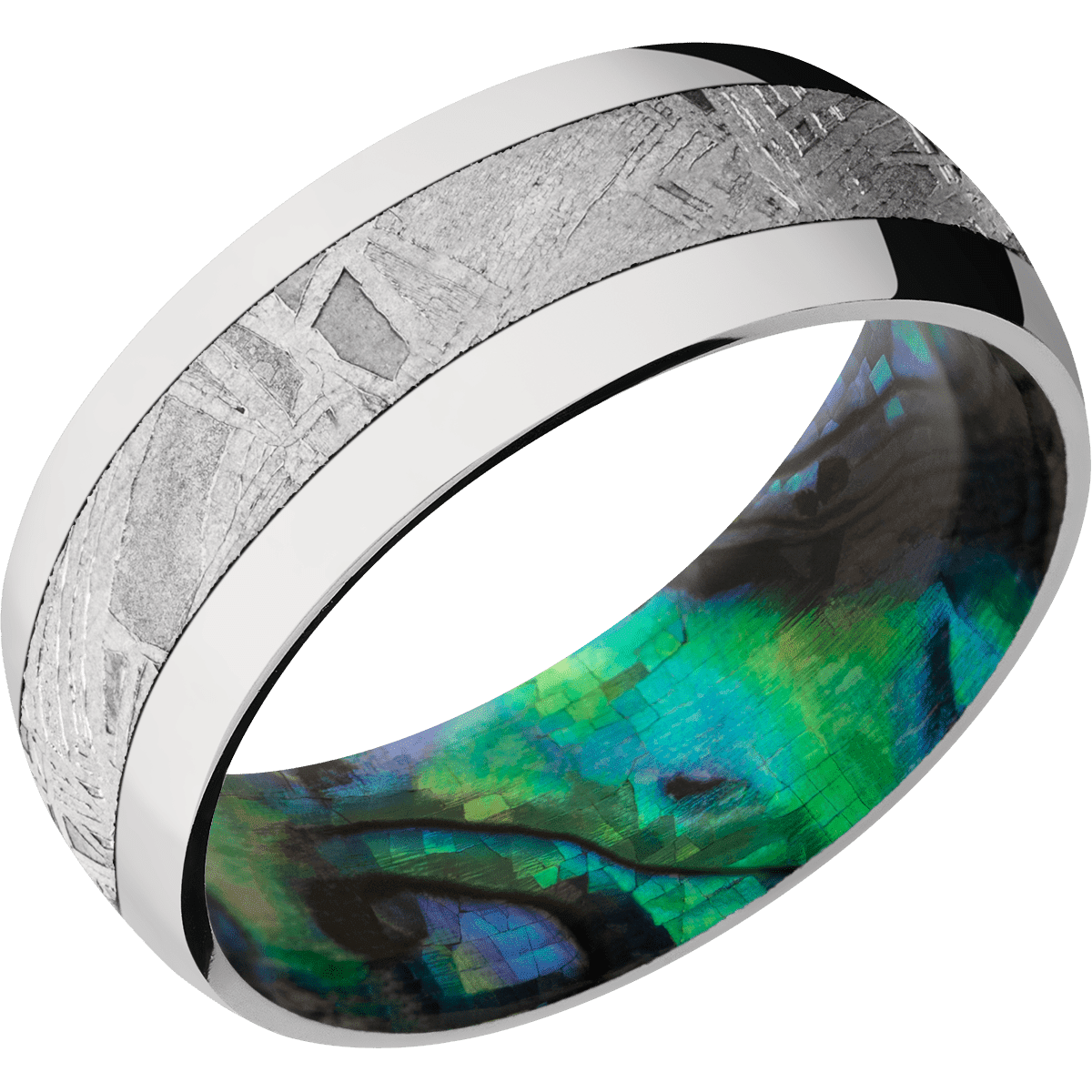 8 mm wide/Domed/Platinum band with one 4 mm Centered inlay of Meteorite also featuring a Abalone sleeve.