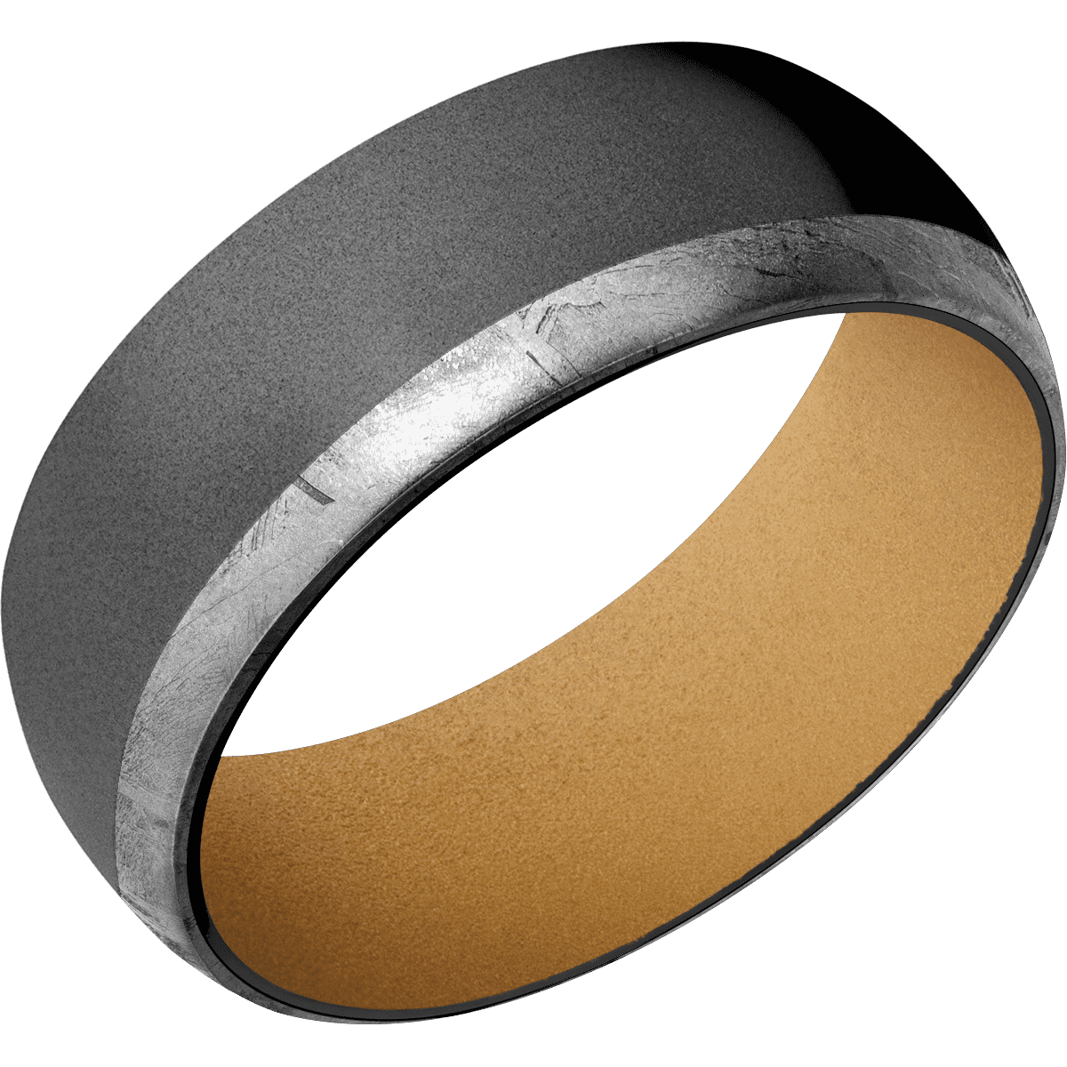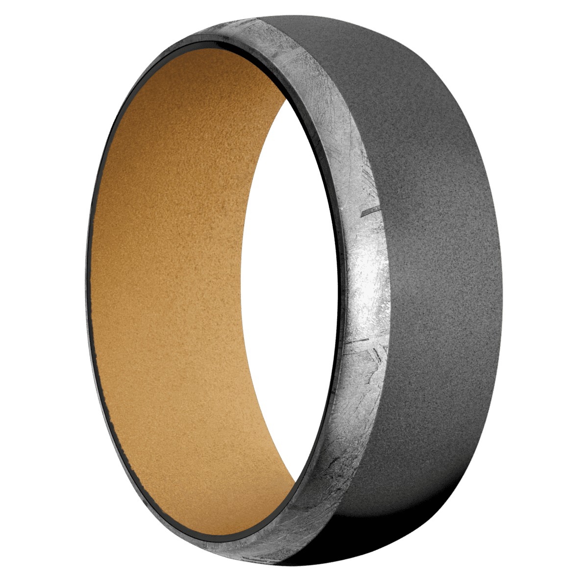 8 mm wide/Domed/Zirconium band with one 2 mm Off Center Edge inlay of Meteorite also featuring a Gold sleeve.