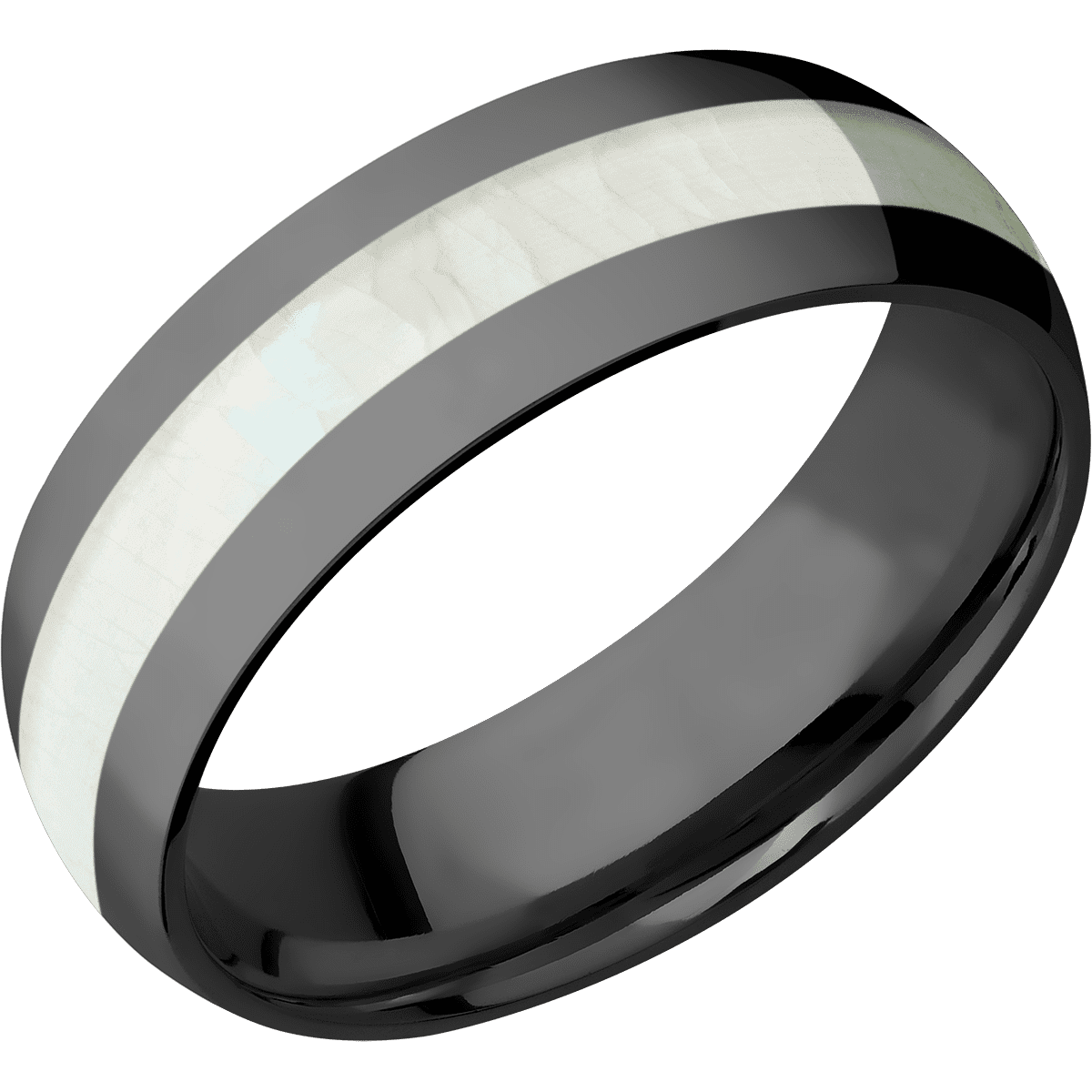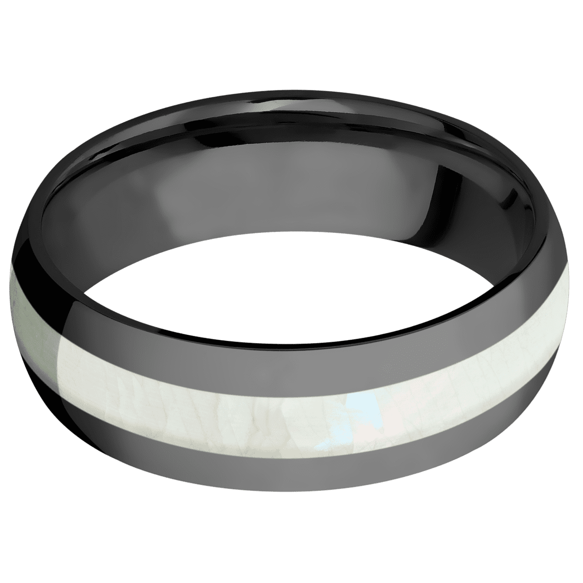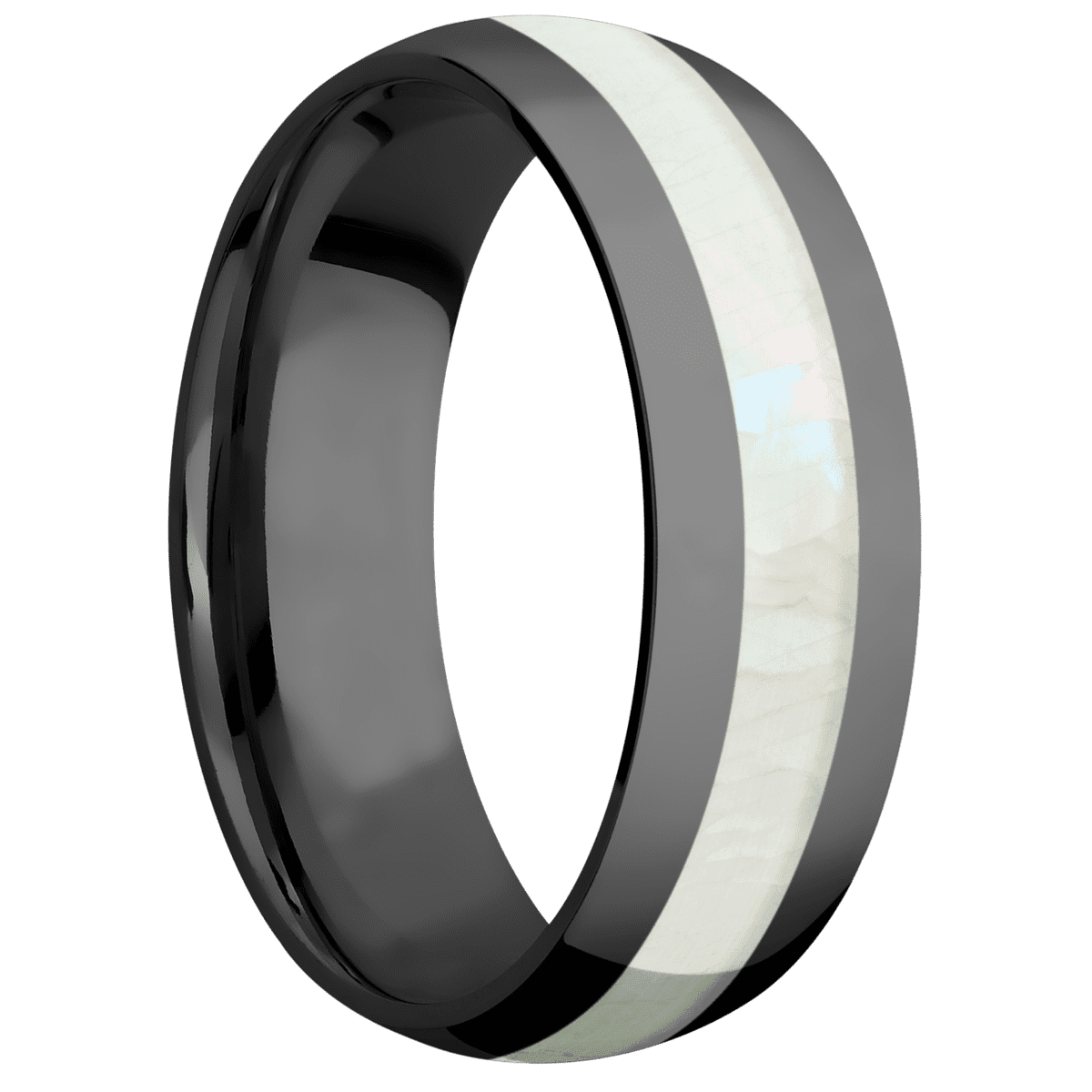 7 mm wide/Domed/Zirconium band with one 3 mm Centered inlay of Freshwater Mother of Pearl.